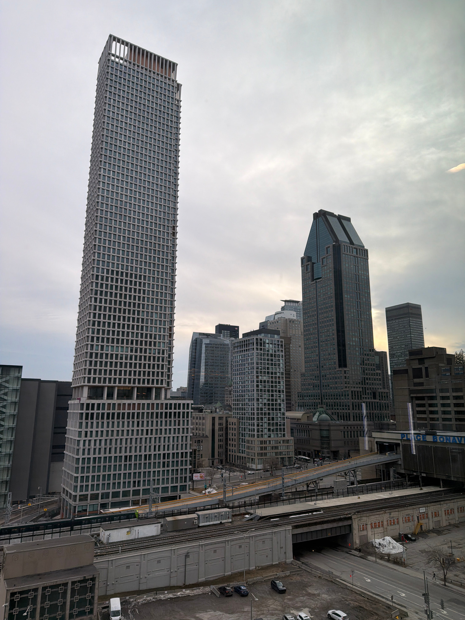 An aerial view shows a dense urban scene in Montreal, Canada. Multiple high-rise buildings dominate the skyline, with various architectural styles. The tallest building is a large rectangular structur…read more