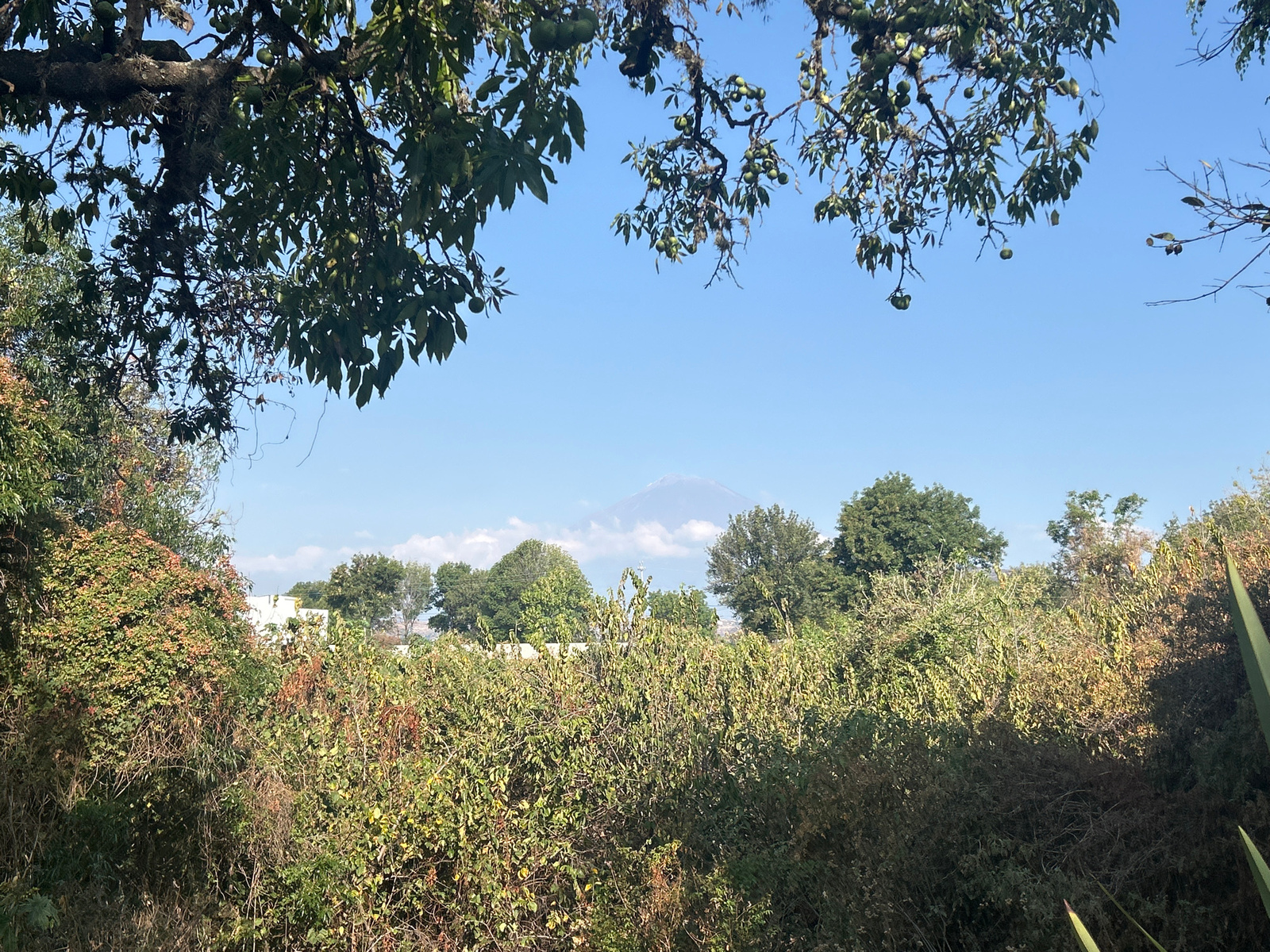 The image depicts a landscape scene likely taken in or near Atlixco, Mexico, due to the presence of a volcano in the background, possibly Popocatépetl, which is often visible from that region. The foreground features dense, overgrown vegetation, primarily consisting of shrubs and bushes. Above and framing the view is foliage from trees, some of which appear to have fruit hanging from them. In the mid-ground, there are more trees interspersed with glimpses of what appears to be a building or structure, possibly a house or other construction, behind the foliage. The sky is clear and blue. | Open Wire