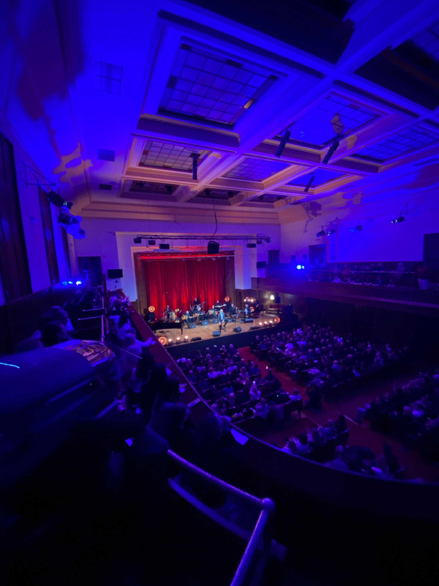 The image depicts an overhead view of a concert hall, likely within a historic building in Belgrade, Serbia. The scene is predominantly lit in blue. A stage is visible with a closed red curtain, a mus…read more