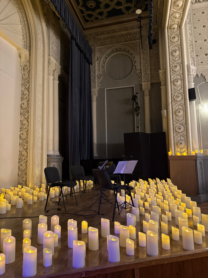 The image displays the ornate interior of a performance hall, identified as the Kyiv House of Scientists (Karaite Kenesa) in Kyiv, Ukraine. The scene is illuminated by hundreds of LED pillar candles o…read more