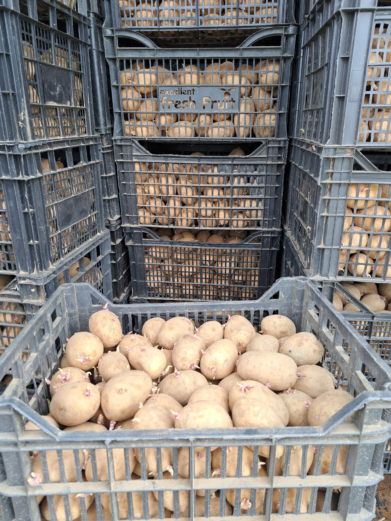 The image shows several black plastic crates stacked atop one another. The crates are filled with potatoes, some of which have begun to sprout. Some of the crates have the words "excellent fresh fruit…read more