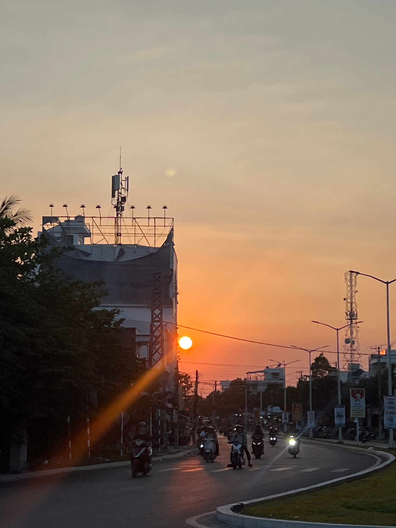 The image depicts a sunset in what appears to be a city, possibly Tây Nha Trang, Vietnam, given the information provided. The sun is low in the sky, casting a warm orange glow. In the foreground, there's a structure with a billboard frame partially obscured by trees. A road runs alongside the structure, featuring motorcycles with headlights on. Overhead power lines and utility poles are visible against the sky. The sky itself transitions from light orange near the horizon to a paler shade higher up. The overall atmosphere is hazy. | Open Wire
