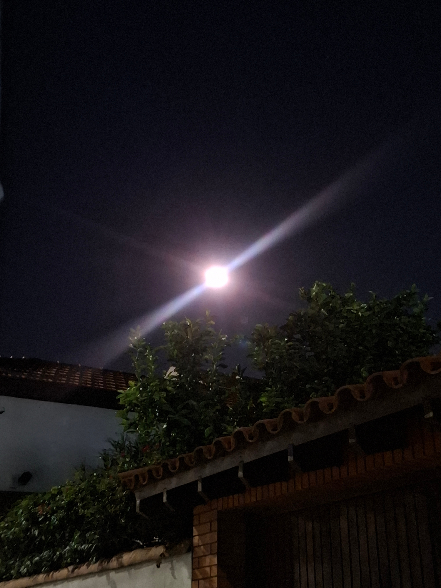The image shows a night scene, possibly in Wilde, Argentina, judging by the urban setting and flora. A bright light source, likely a street lamp, dominates the center of the frame, creating a strong g…read more