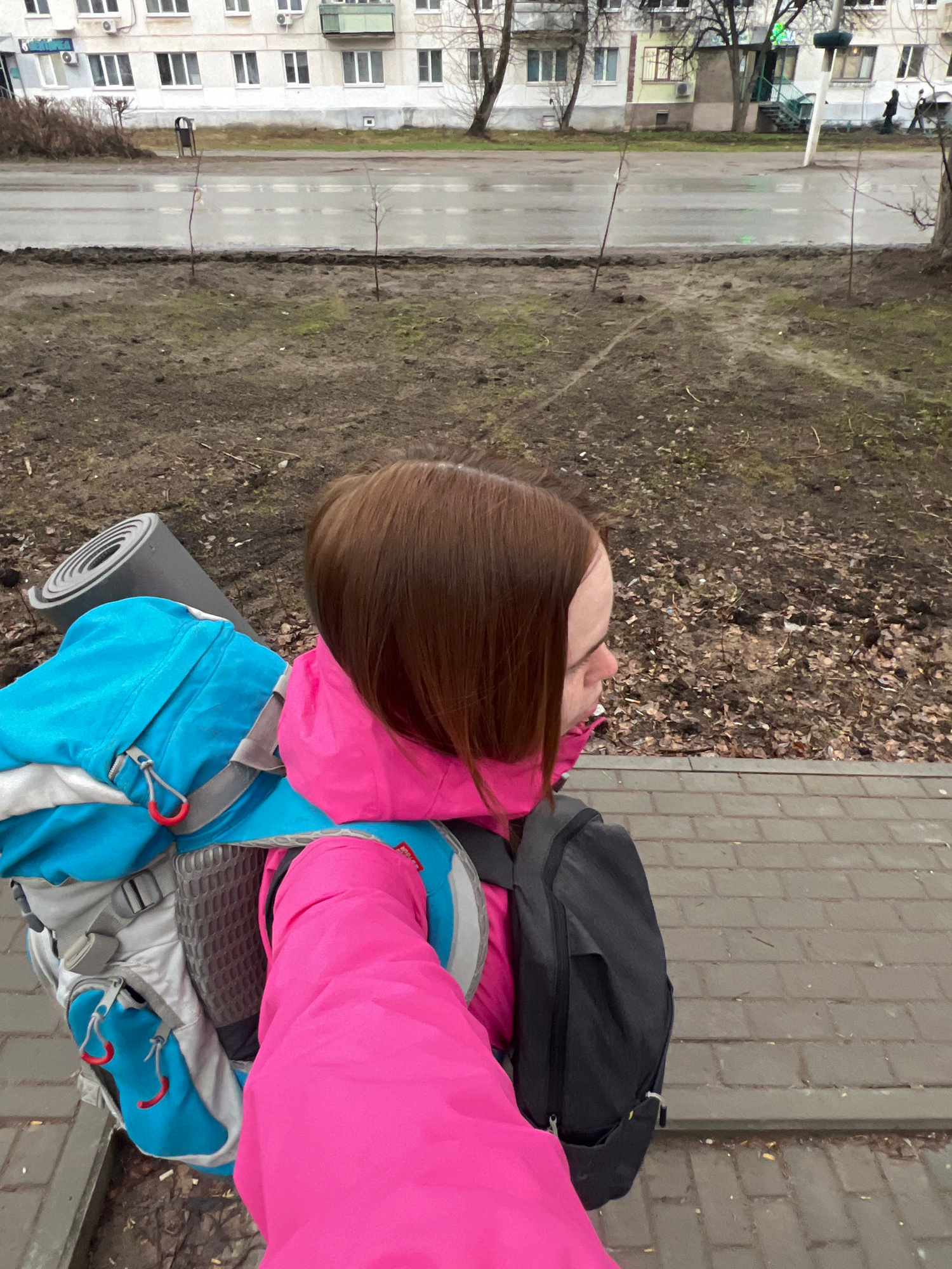 A person with brown hair, wearing a pink jacket and a blue backpack with a sleeping mat attached, stands on a brick sidewalk. To the left, there is a street and a multi-story building with white walls…read more