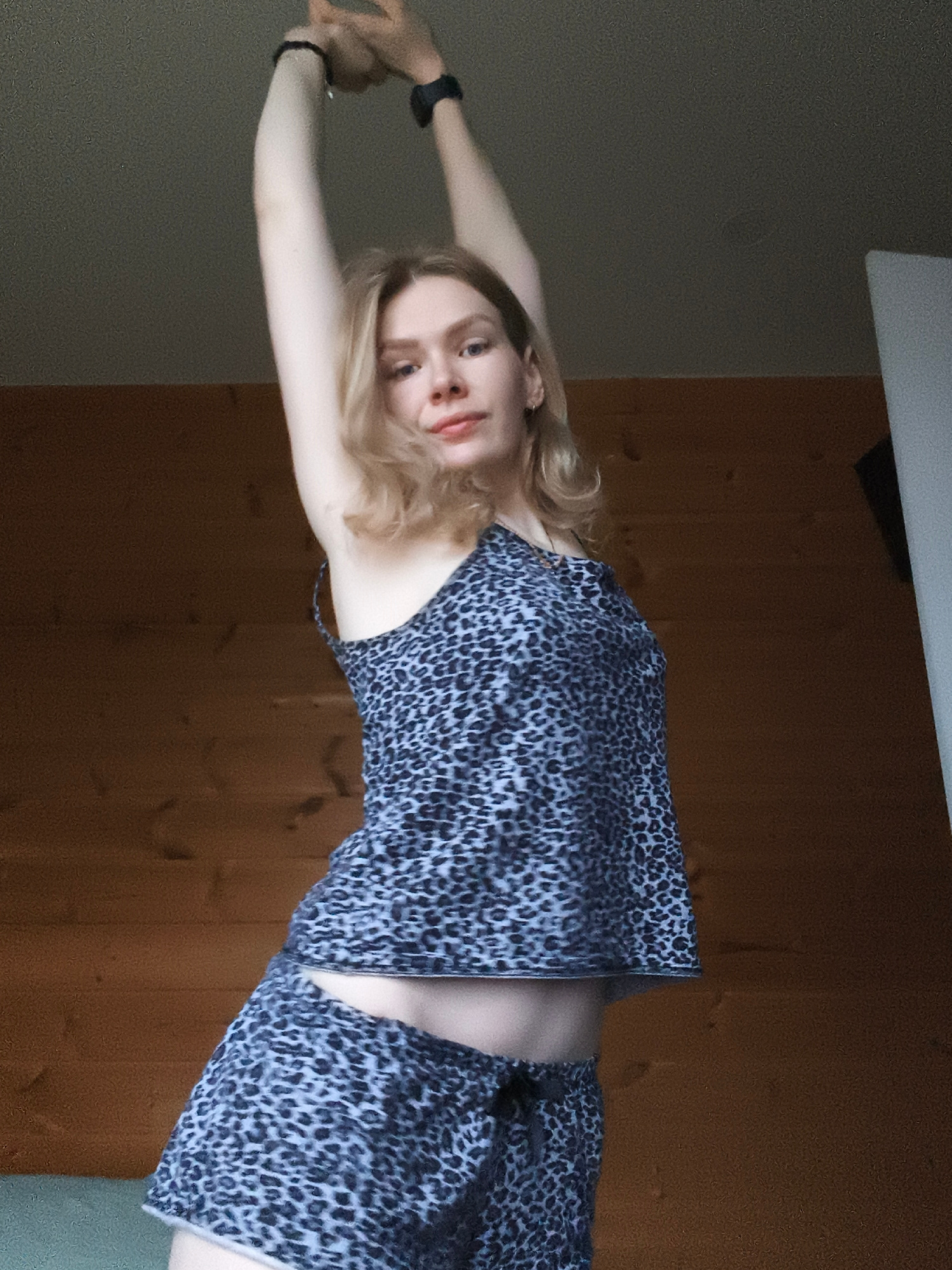 A fair-skinned woman with shoulder-length blonde hair stands indoors, wearing a matching blue and grey leopard-print tank top and shorts. She has both arms raised above her head, slightly bent at the…read more