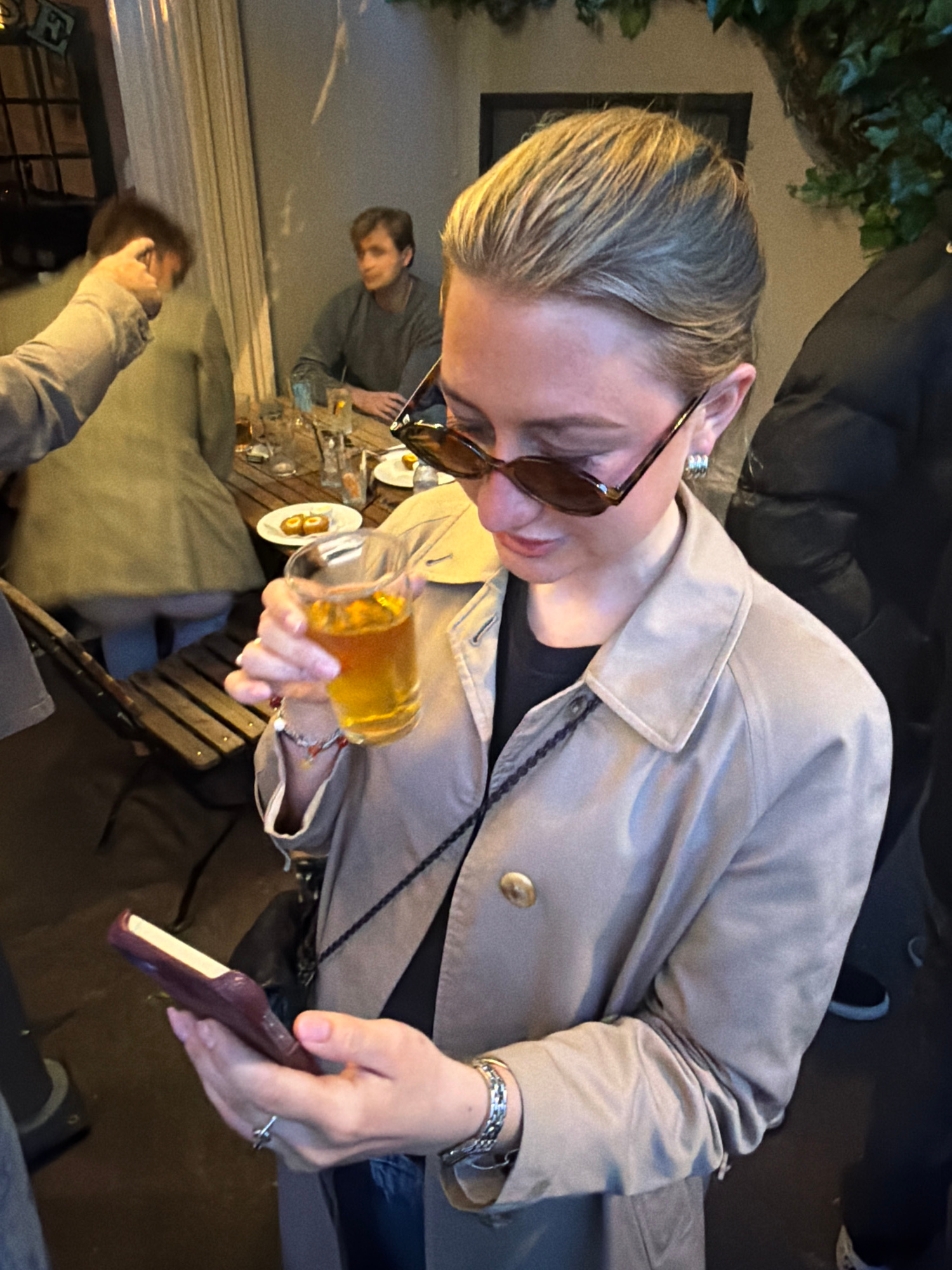 A woman wearing sunglasses and a beige jacket is holding a glass of amber liquid in her left hand and a small brown object in her right. She is sitting at a wooden table in an outdoor setting, presuma…read more