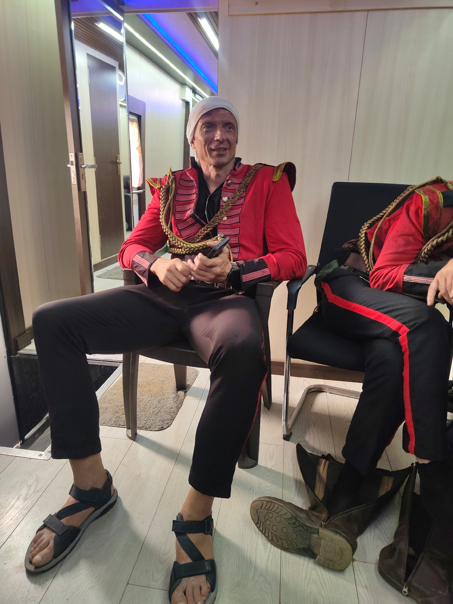 The image shows two individuals in what appears to be a dressing room. One person, primarily visible, is sitting in a chair, wearing a red military-style jacket with gold rope details, black pants, a…read more