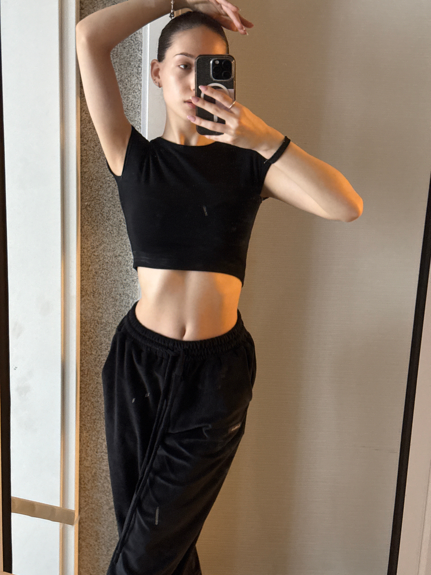 A woman is lying on a gray carpeted floor, seemingly taking a selfie in a mirror. She is wearing a black crop top and black sweatpants. Her left arm is raised, holding a black smartphone. Her head is…read more