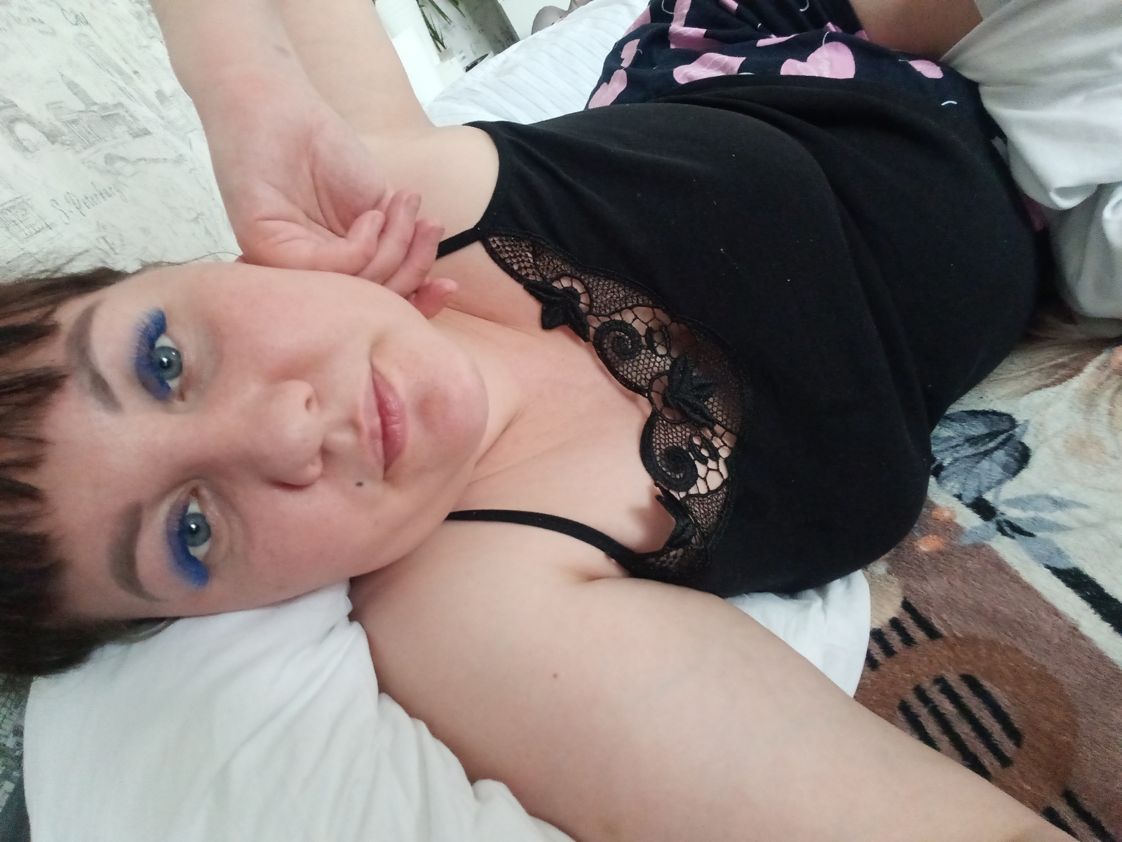 A woman is lying on a bed, smiling and looking at the camera. She is wearing a black tank top with lace trim and black shorts with pink hearts. She has blue eyeshadow on her eyelids. The bed has a whi…read more