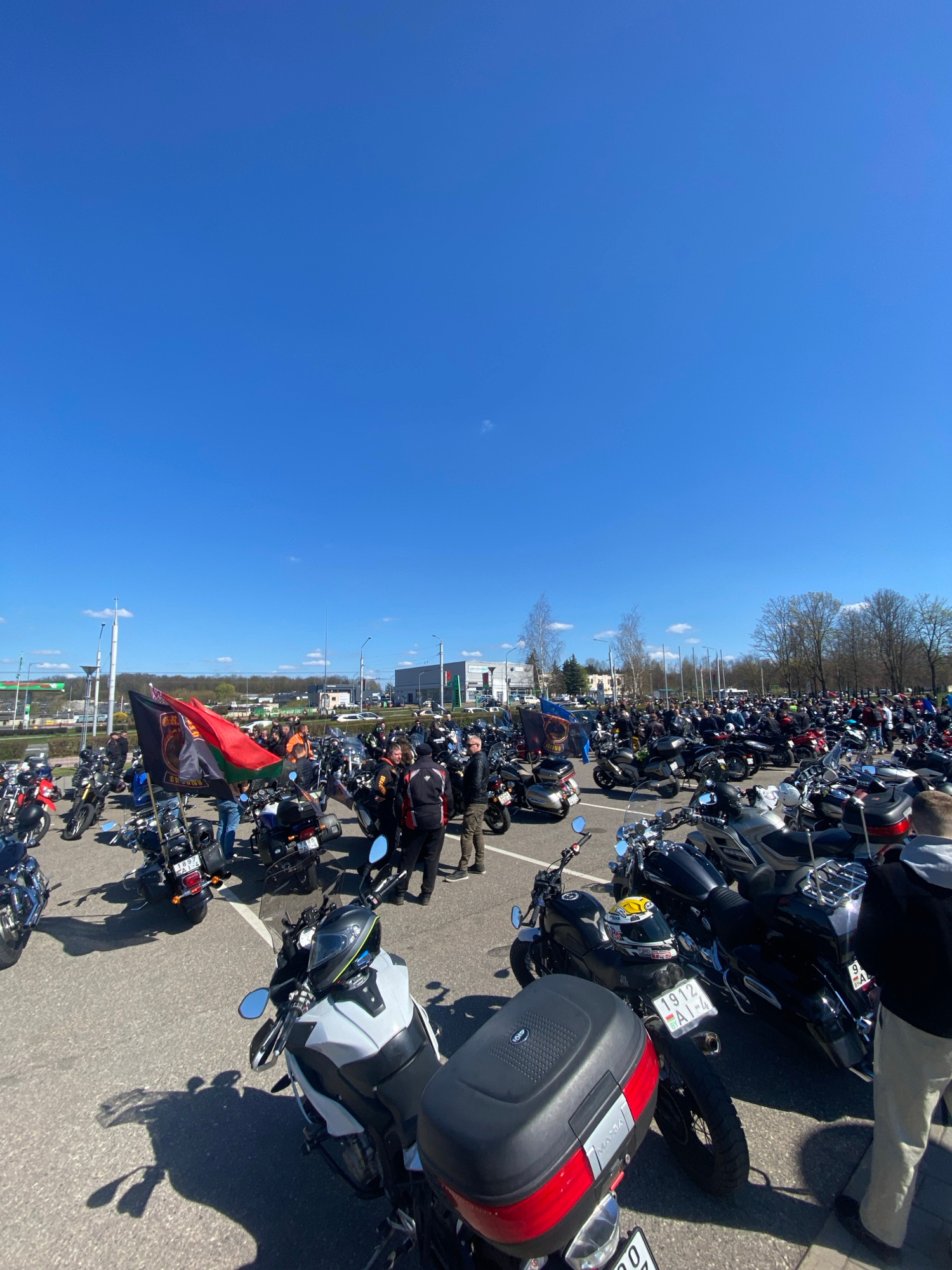 The image shows a large parking lot in Hrodna, Belarus, filled with motorcycles. Many people are visible among the motorcycles, suggesting an event or gathering. A flag with what appears to be a club…read more