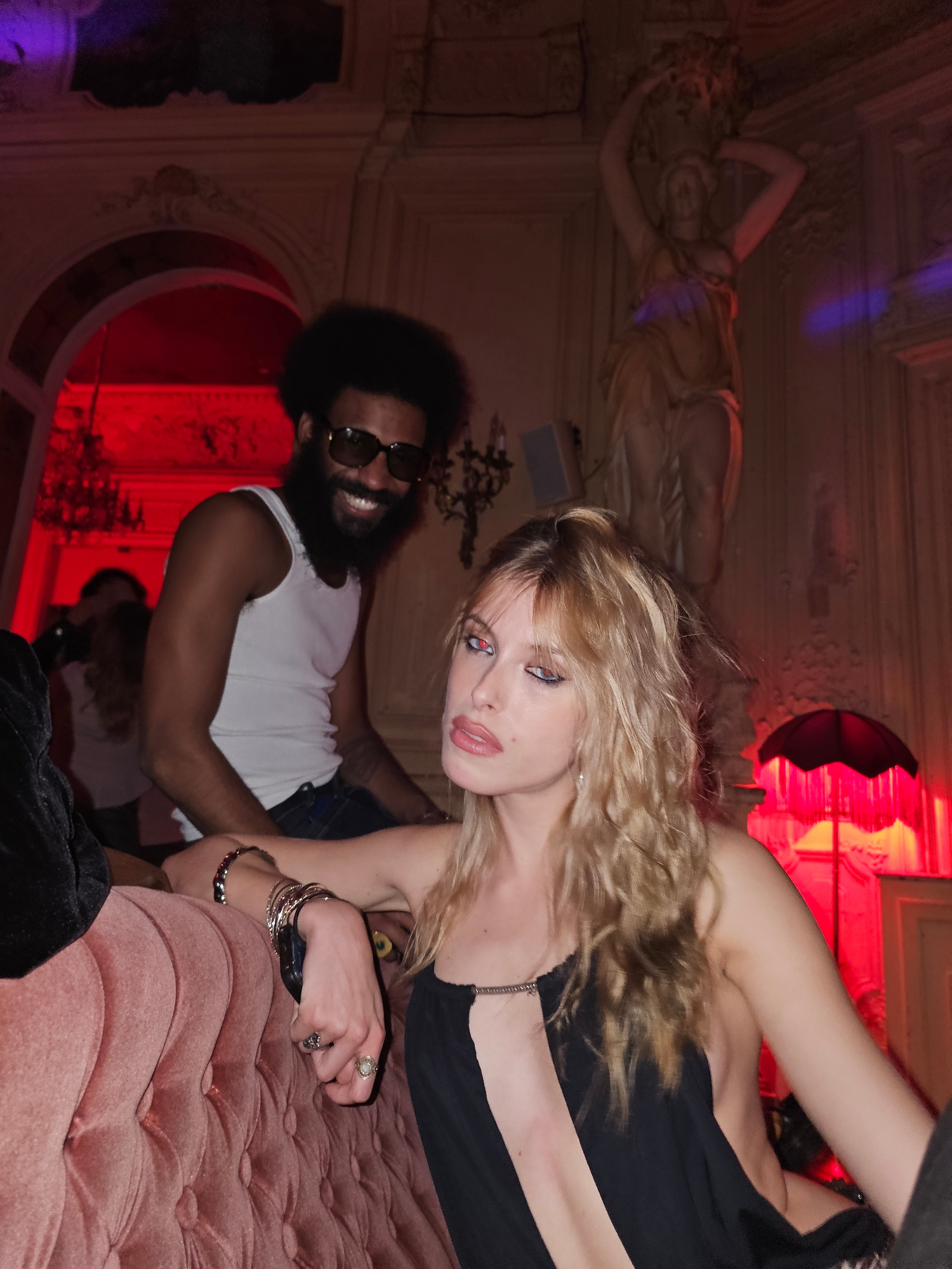 The photograph shows a Caucasian woman with blonde, wavy hair and pale skin, and an African-American man with a beard and sunglasses in an ornate interior. The woman is in the foreground wearing a bla…read more