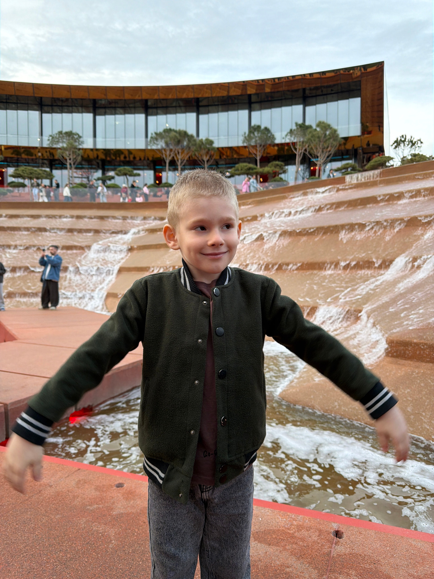 A young boy stands near a water feature. The boy has short, light hair and wears a dark green button-up jacket with white stripes on the sleeves and grey jeans. His arms are outstretched. Behind him i…read more
