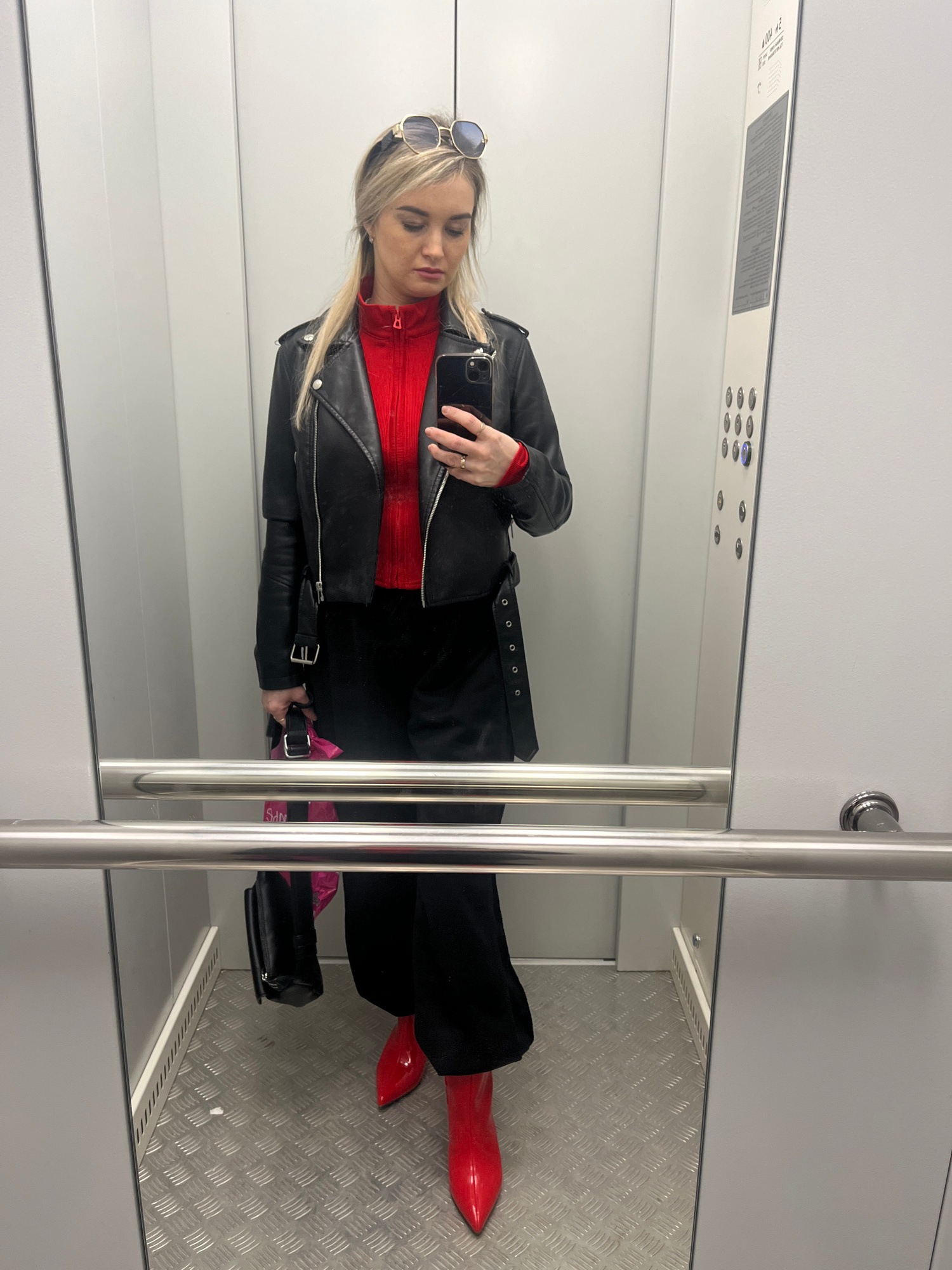 A young woman is taking a selfie in an elevator with white walls and a steel-plated floor. She is wearing a red top, black pants, a black leather jacket, and red pointed-toe boots. Sunglasses are perc…read more