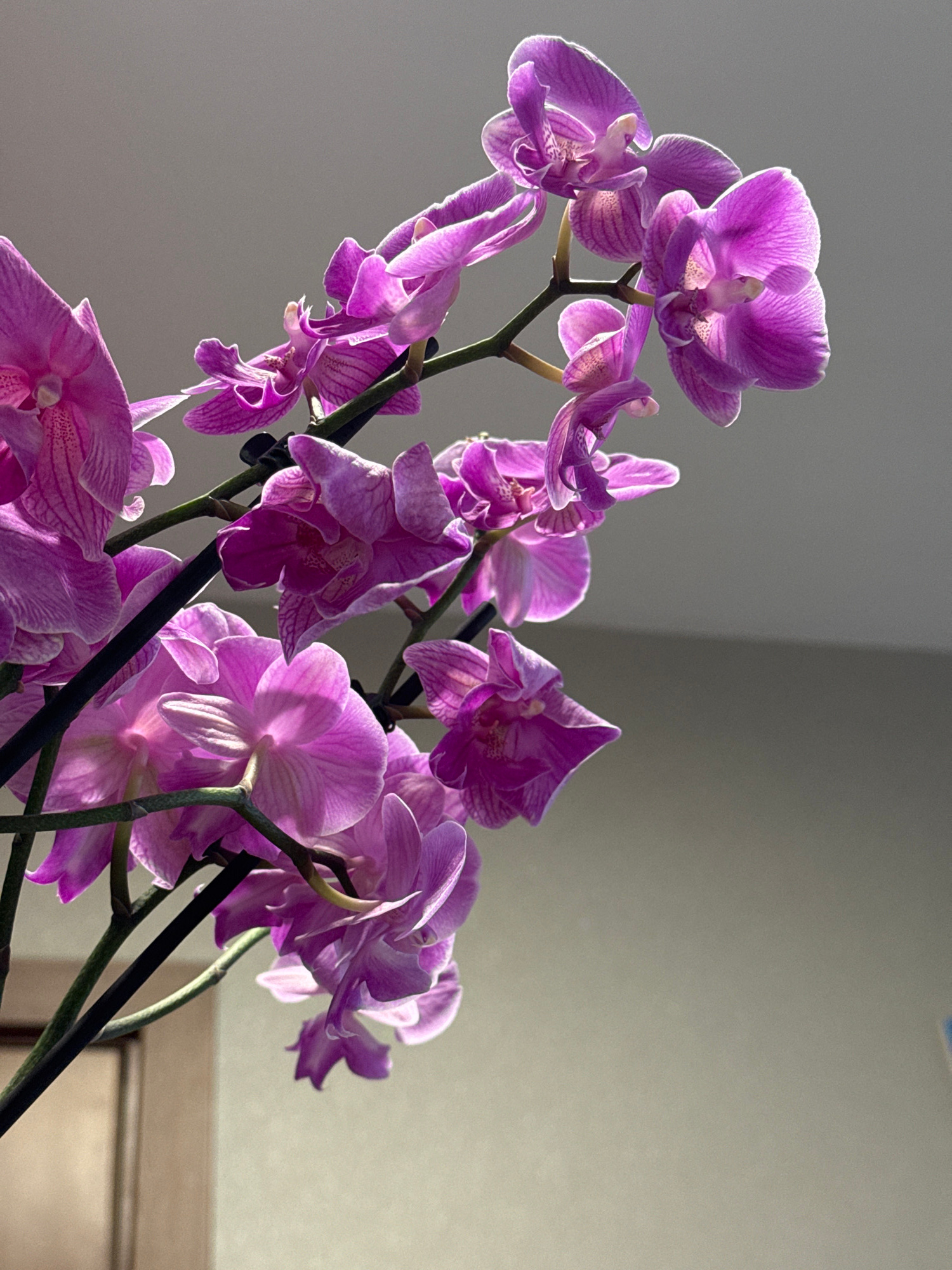 The image depicts a cluster of purple orchid flowers in full bloom. The flowers are prominently featured against a muted gray background, with a hint of a wall or surface visible at the lower right. T…read more
