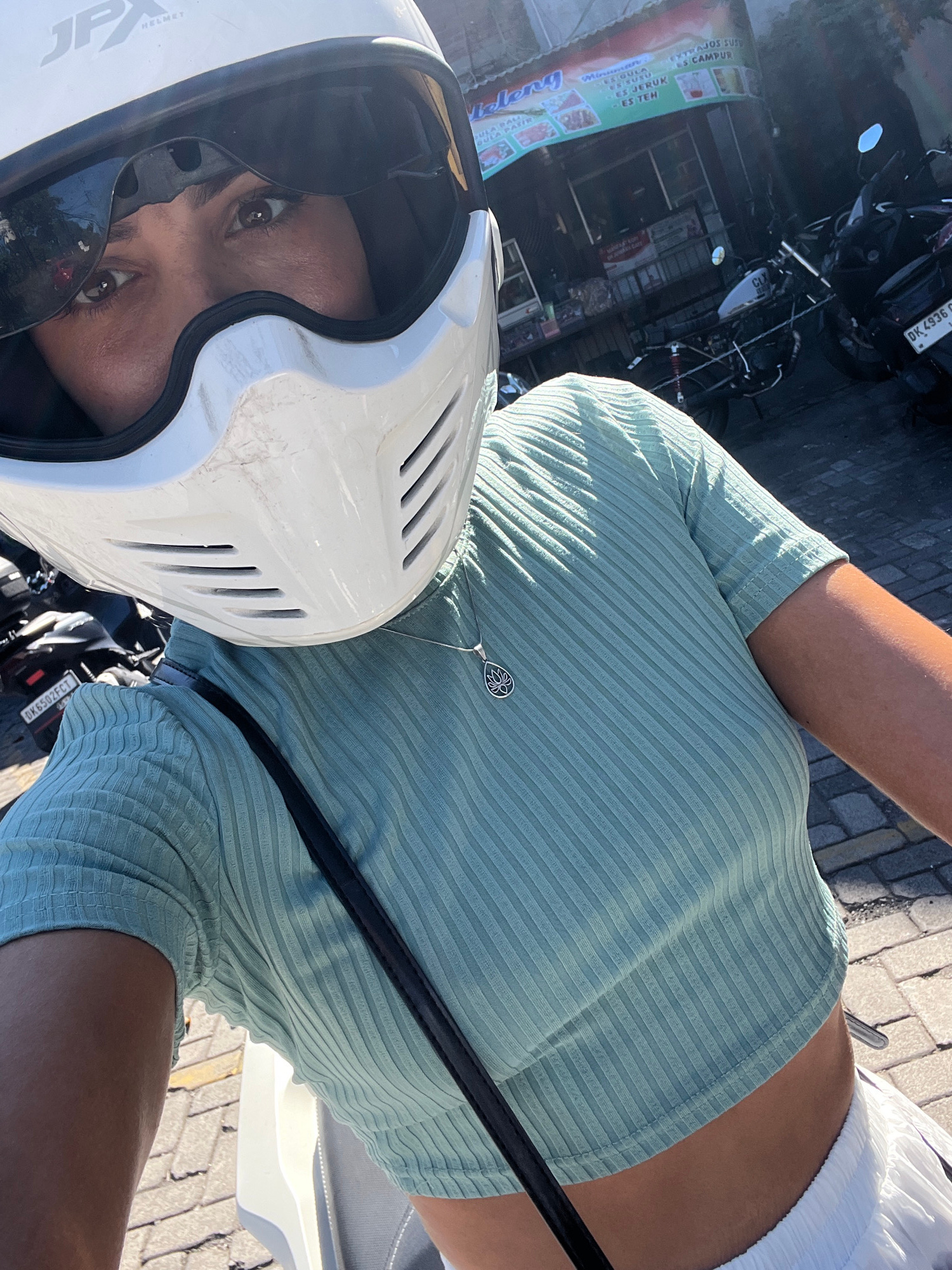 A woman wearing a white helmet and a light green ribbed top is taking a selfie on a motorcycle in Kuta Selatan, Indonesia. Visible on the left is a sign that mentions several food items including "GUL…read more