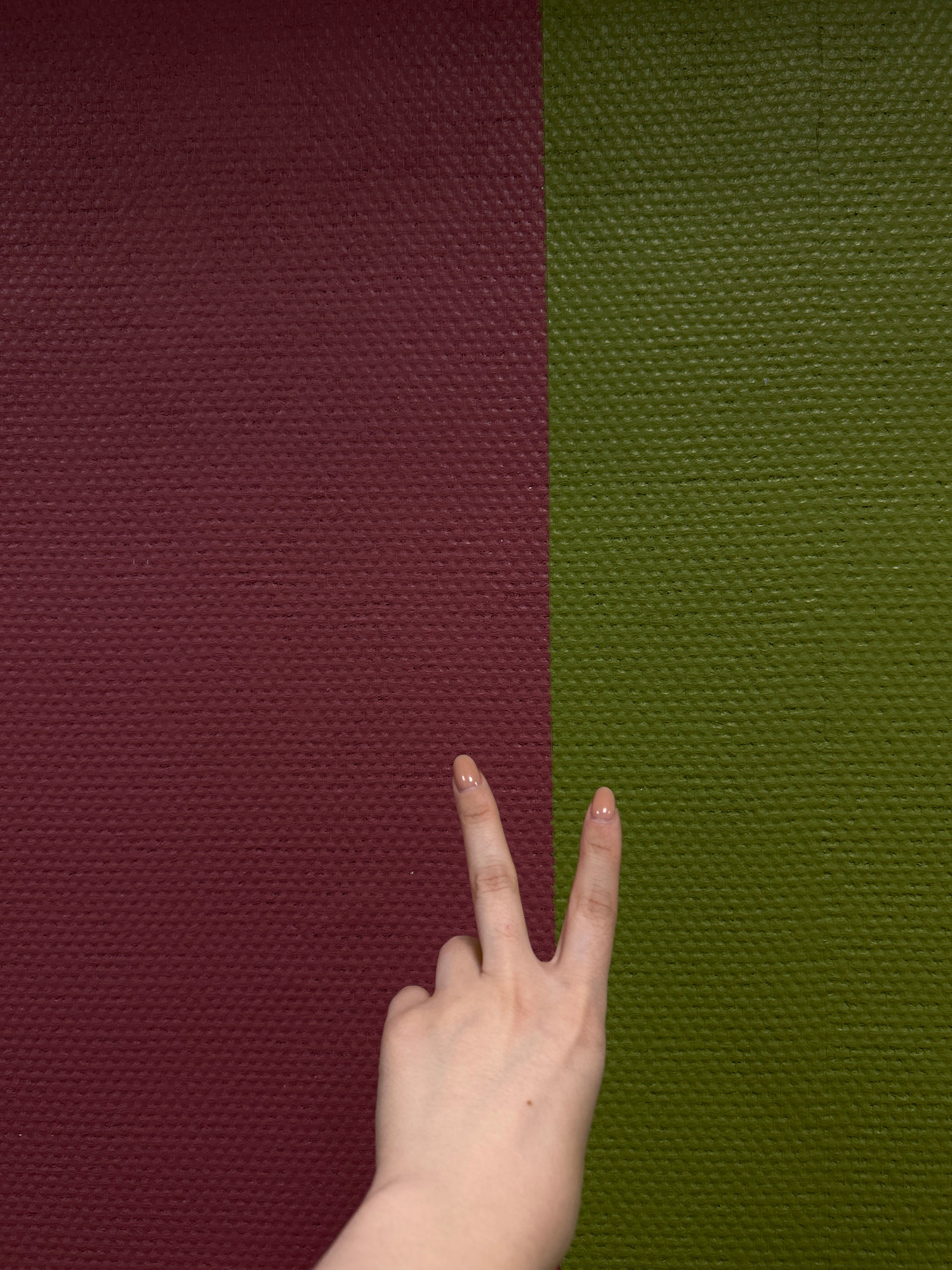 The image displays a human hand making a "peace" or "victory" sign against a two-toned, textured background. The hand, positioned on the right side of the frame, has light skin and fingernails adorned…read more