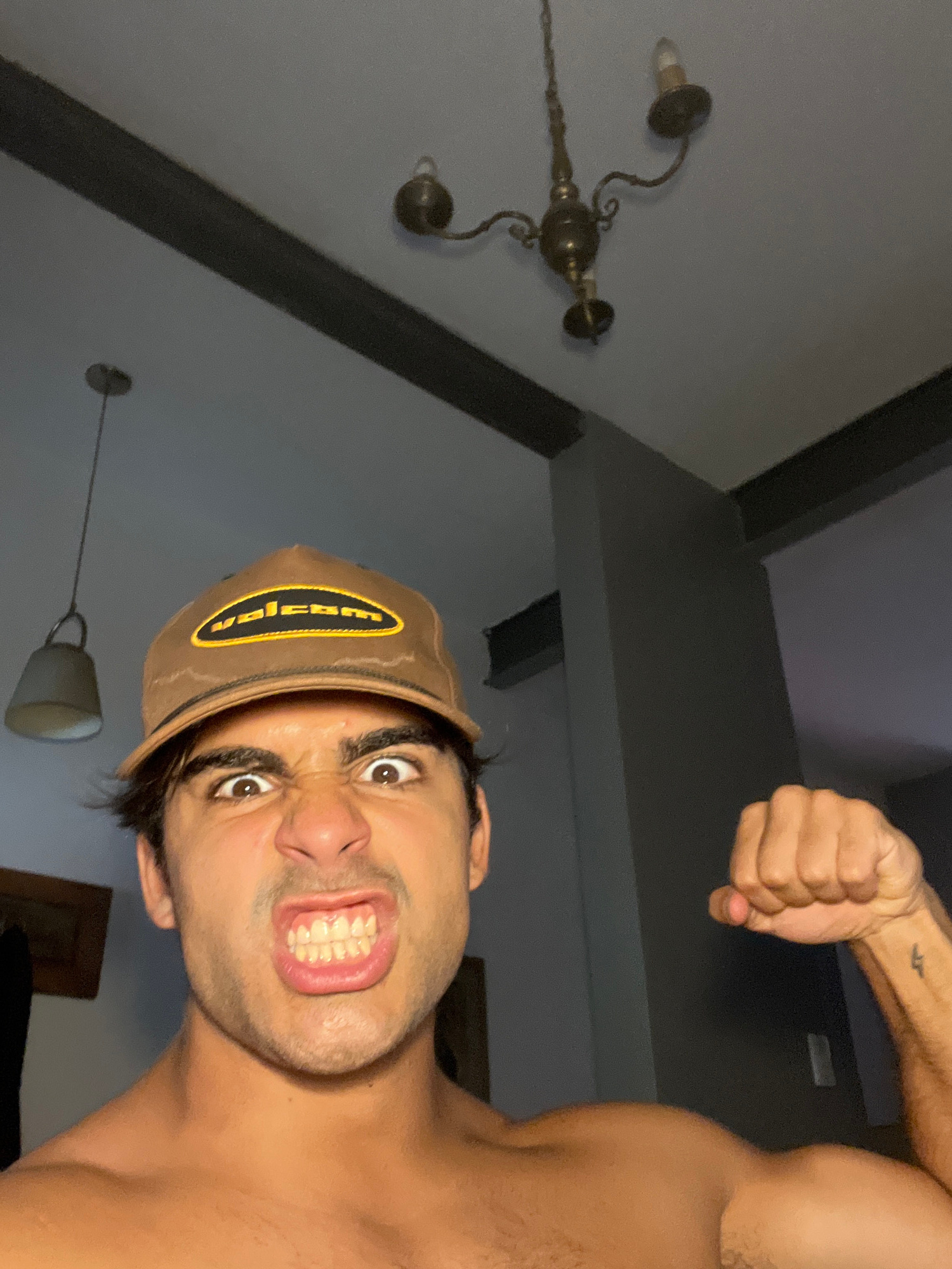 This is an indoor, vertically oriented image of a young man, shirtless, posing with a playful yet intense expression. The man, likely located in Avellaneda, Argentina, is seen from a low angle, lookin…read more