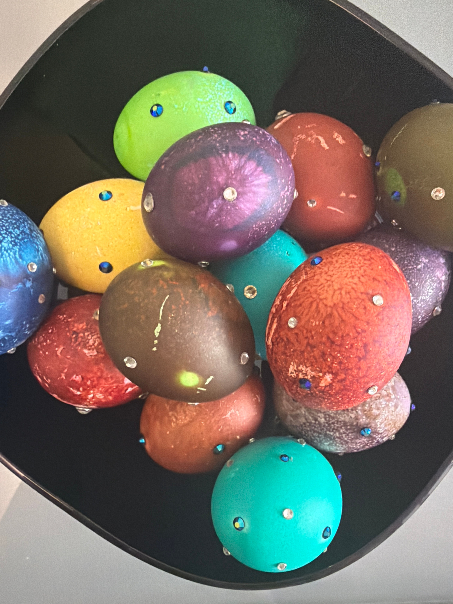 A close-up, high-angle shot depicts a black bowl filled with a collection of decorated Easter eggs. The eggs vary in color, including shades of green, yellow, brown, red, purple, blue, and turquoise.…read more