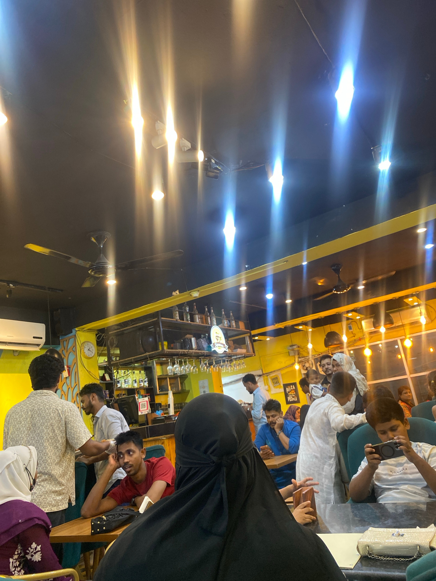 The image depicts the interior of a restaurant in Dhaka, Bangladesh. Multiple people are seated at tables, appearing to be dining. Some are interacting with each other, while others are looking at the…read more