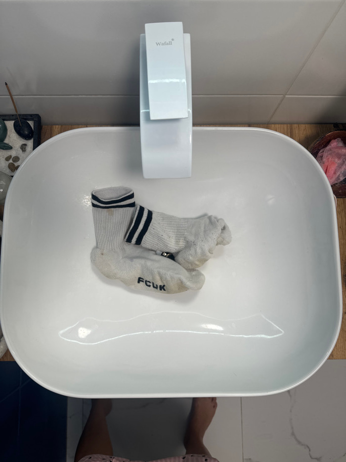 A pair of worn white socks with black stripes and the letters "FCUK" are placed inside a white, rounded rectangular sink. The sink has a white, minimalist faucet attached to its side. The surrounding…read more