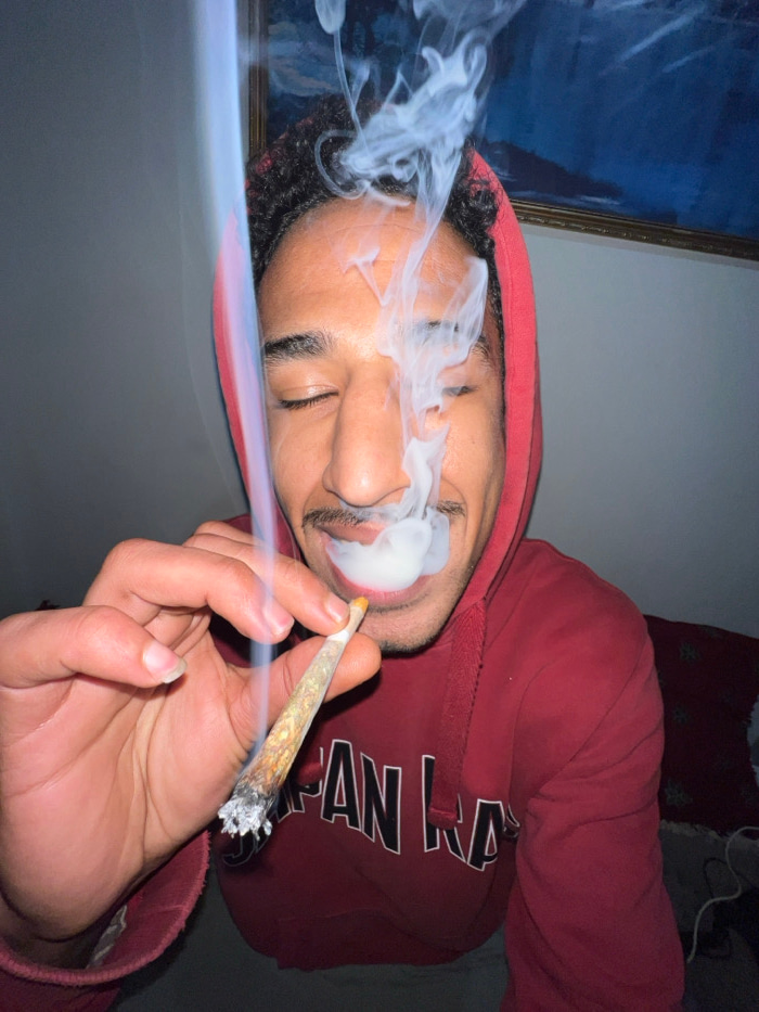 A male individual with dark curly hair and a mustache is depicted in a close-up, chest-up shot, indoors within what is understood to be a private residence in Tanger, Morocco. He is wearing a red hood…read more