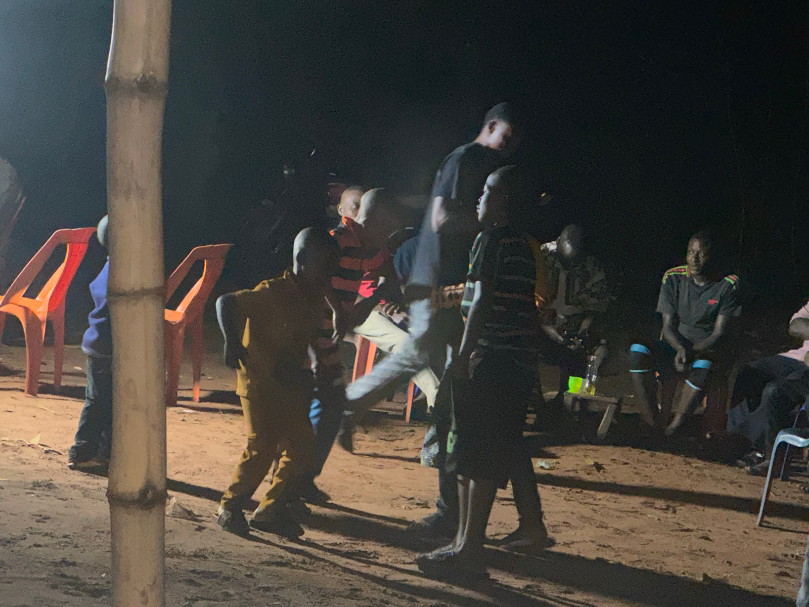The image shows a group of people gathered outdoors at night. The ground appears to be dirt or sand. In the foreground, there is a pole made of light-colored segments. Several orange plastic chairs ar…read more