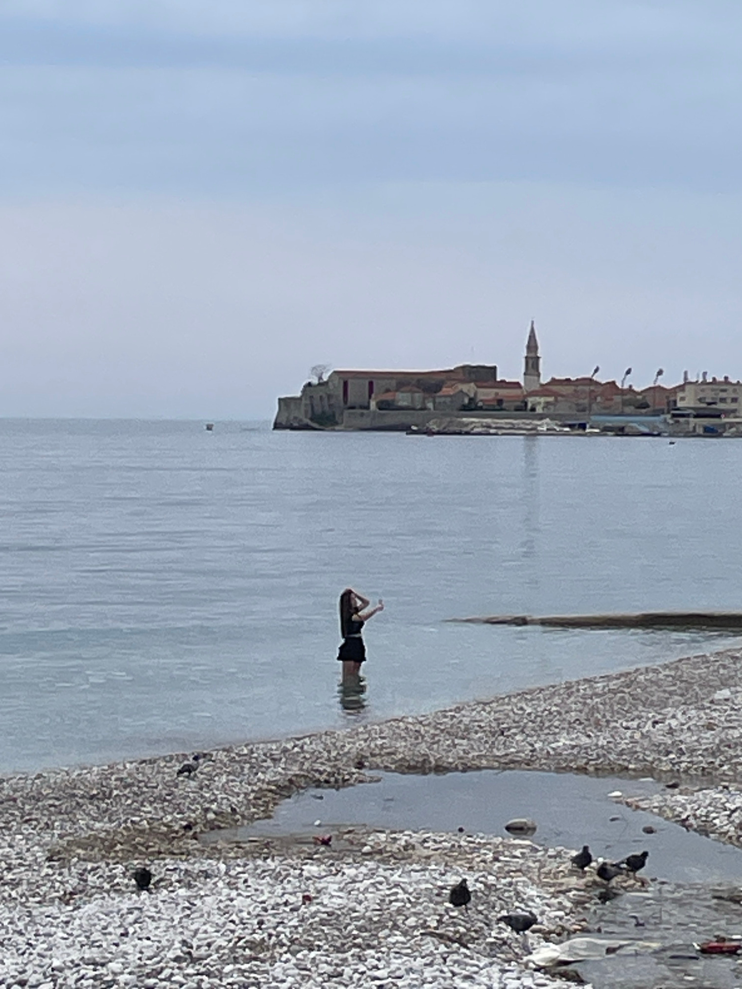 A wide shot captures a cityscape across a body of water, with a swimmer in the foreground. **Cityscape:** On the left, a cityscape displays a cluster of buildings, including a prominent church spire, typical of coastal settlements. The buildings are various sizes and colors. **Body of Water:** The scene is dominated by a large body of water with a gray-blue hue, reflecting the sky. The water appears calm, with minor ripples and reflections. **Swimmer:** A person is swimming in the water, relatively close to the shore. The swimmer is dark, possibly clothed. **Shoreline:** The shoreline appears to be pebble beach with pebbles of varying sizes and colors. Some dark objects, likely birds or rocks, are scattered along the shoreline. **Location:** Considering the architecture of the city, the scene likely depicts the coastal town of Budva, Montenegro. | Open Wire
