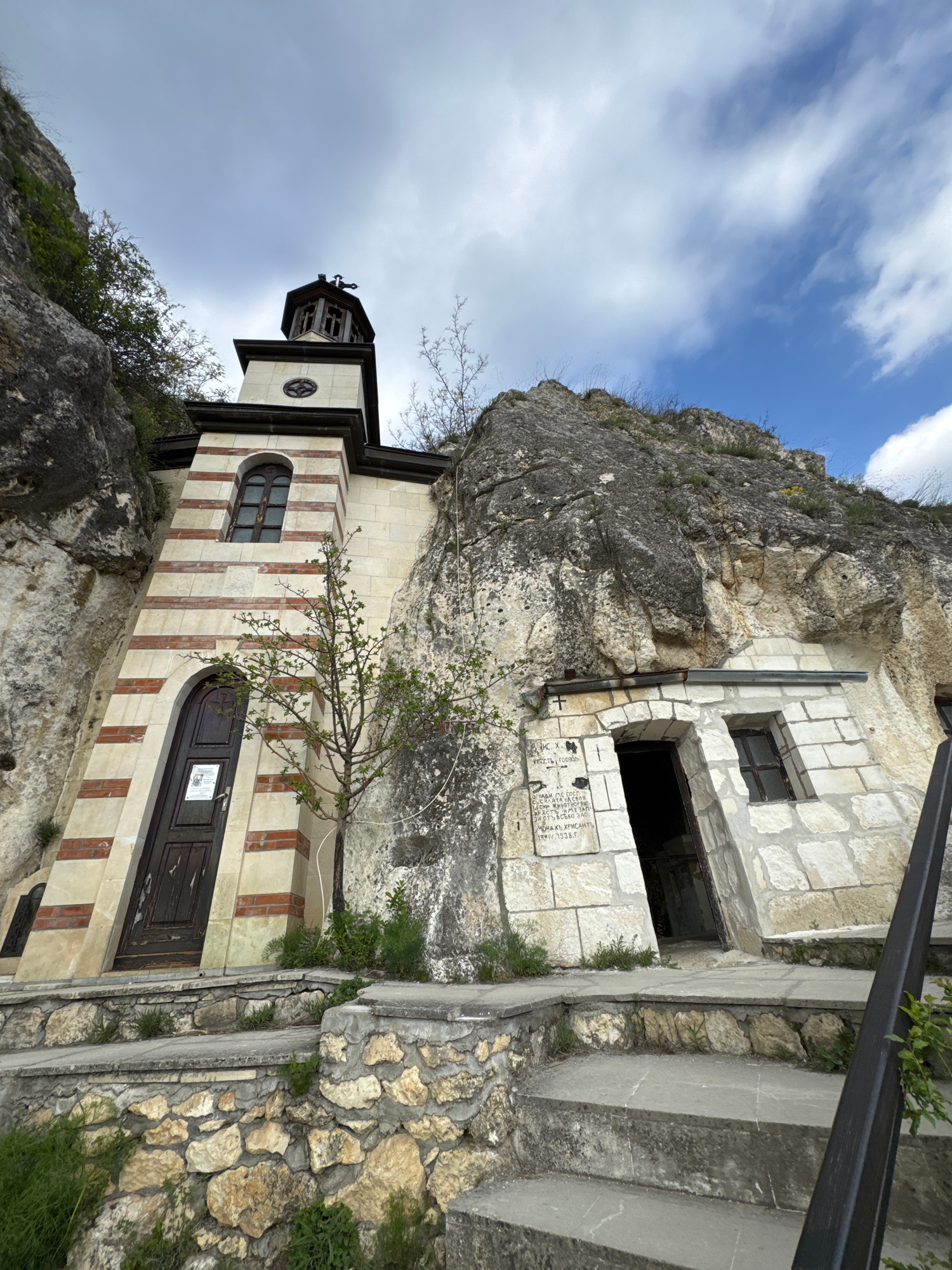 This image depicts the Basarbovo Rock Monastery in Bulgaria, an ancient religious complex integrated into a rugged limestone cliff face under a partly cloudy sky. The scene showcases a fascinating ble…read more