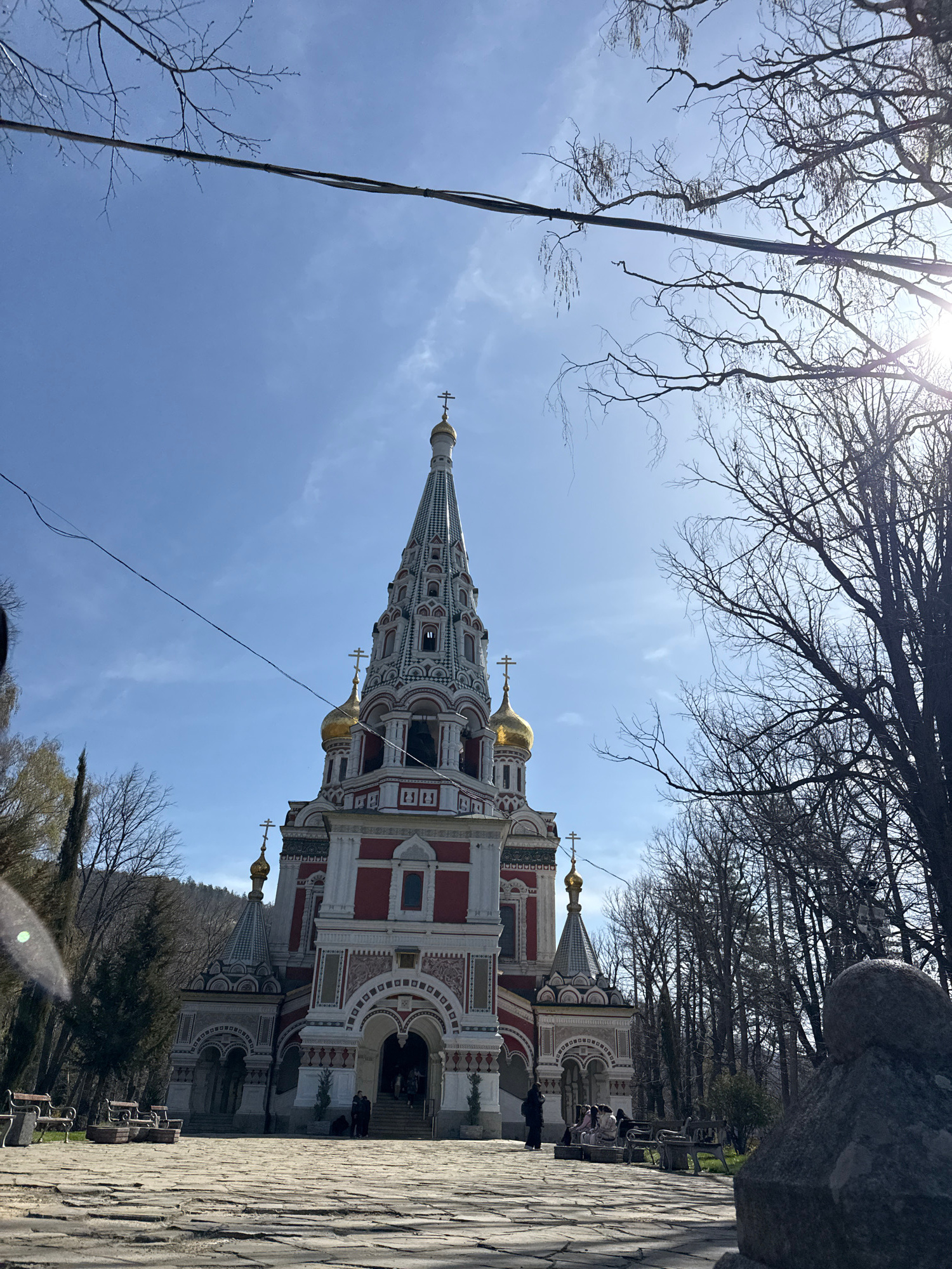 This image presents a vibrant, upward-angled view of the Shipka Memorial Church (Nativity of Christ Church) in Shipka, Bulgaria. The central subject is the grand Eastern Orthodox church, characterized…read more