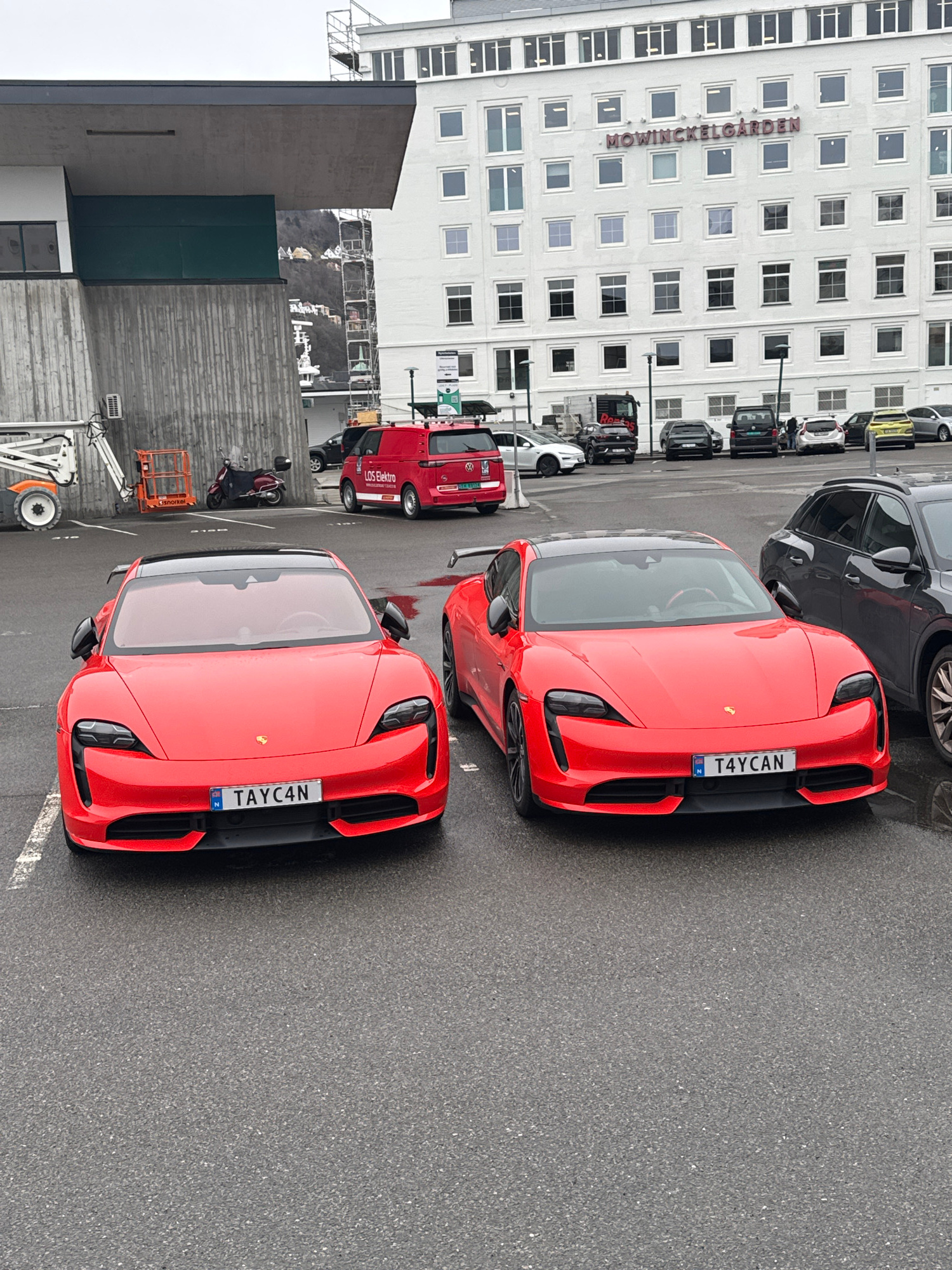 The image shows two red Porsche Taycan vehicles parked in an outdoor parking area. The cars are angled toward the viewer, each displaying a Norwegian license plate with the text "TAYC4N". Behind the c…read more
