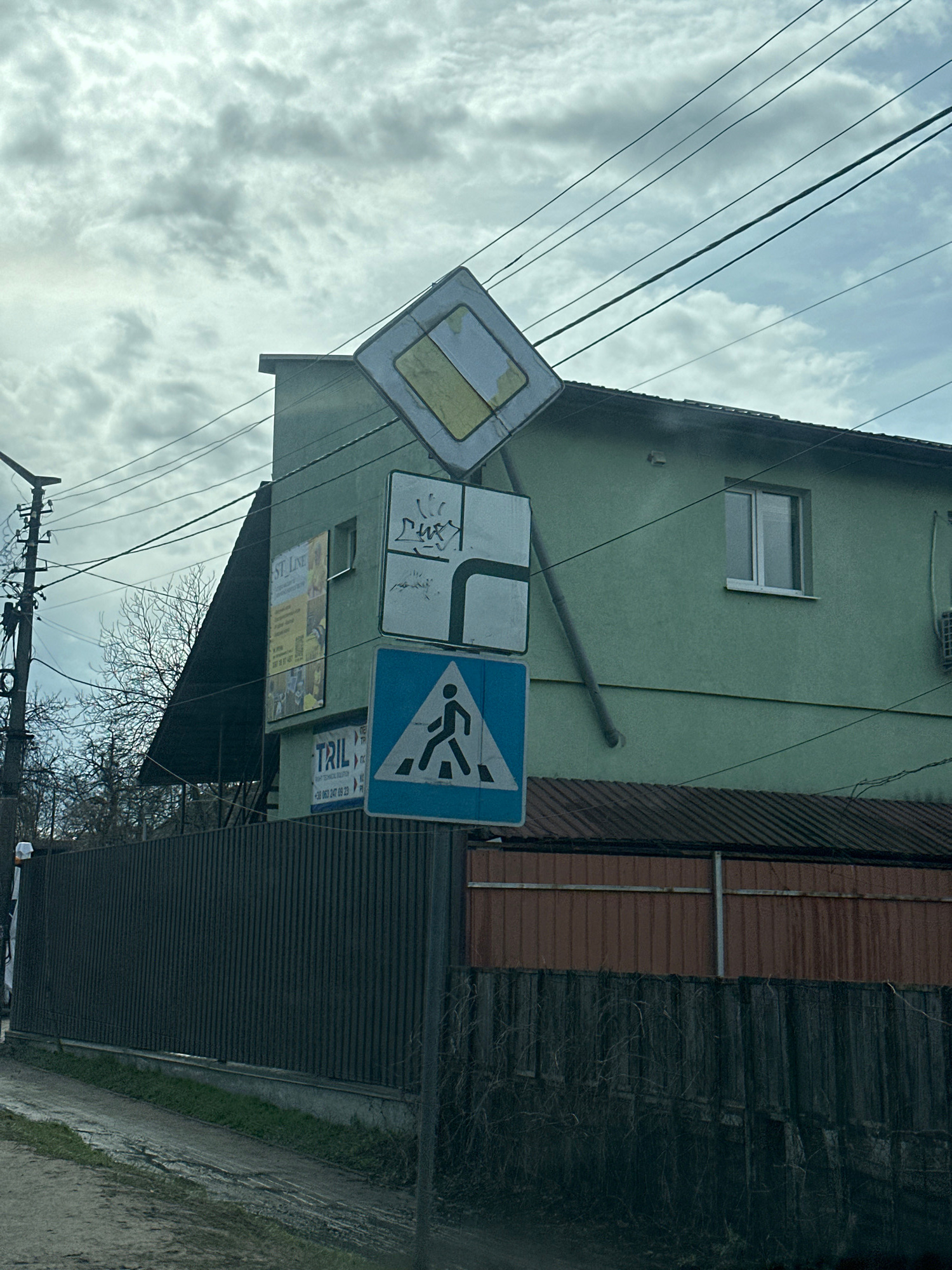 The image shows a building in Irpin, Ukraine, with multiple road signs attached to it. The building is two stories tall, painted light green, and has a brown corrugated metal extension on one side. Thβ¦read more