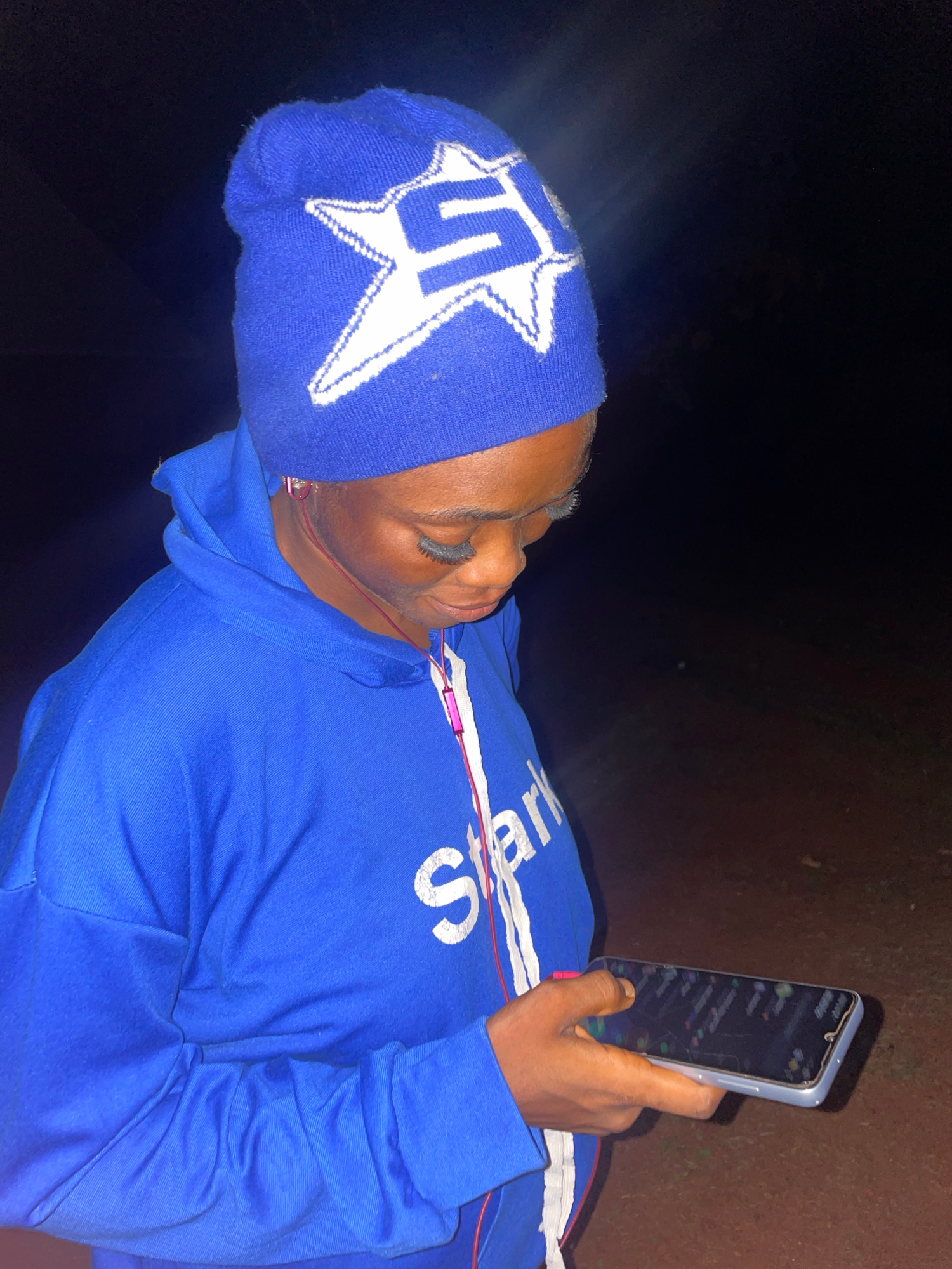 A person is looking at their cell phone in an outdoor area in Ogbe, Nigeria. They are wearing a blue hoodie with white lettering, a blue beanie with a white star, and earrings. The phone screen is lit…read more