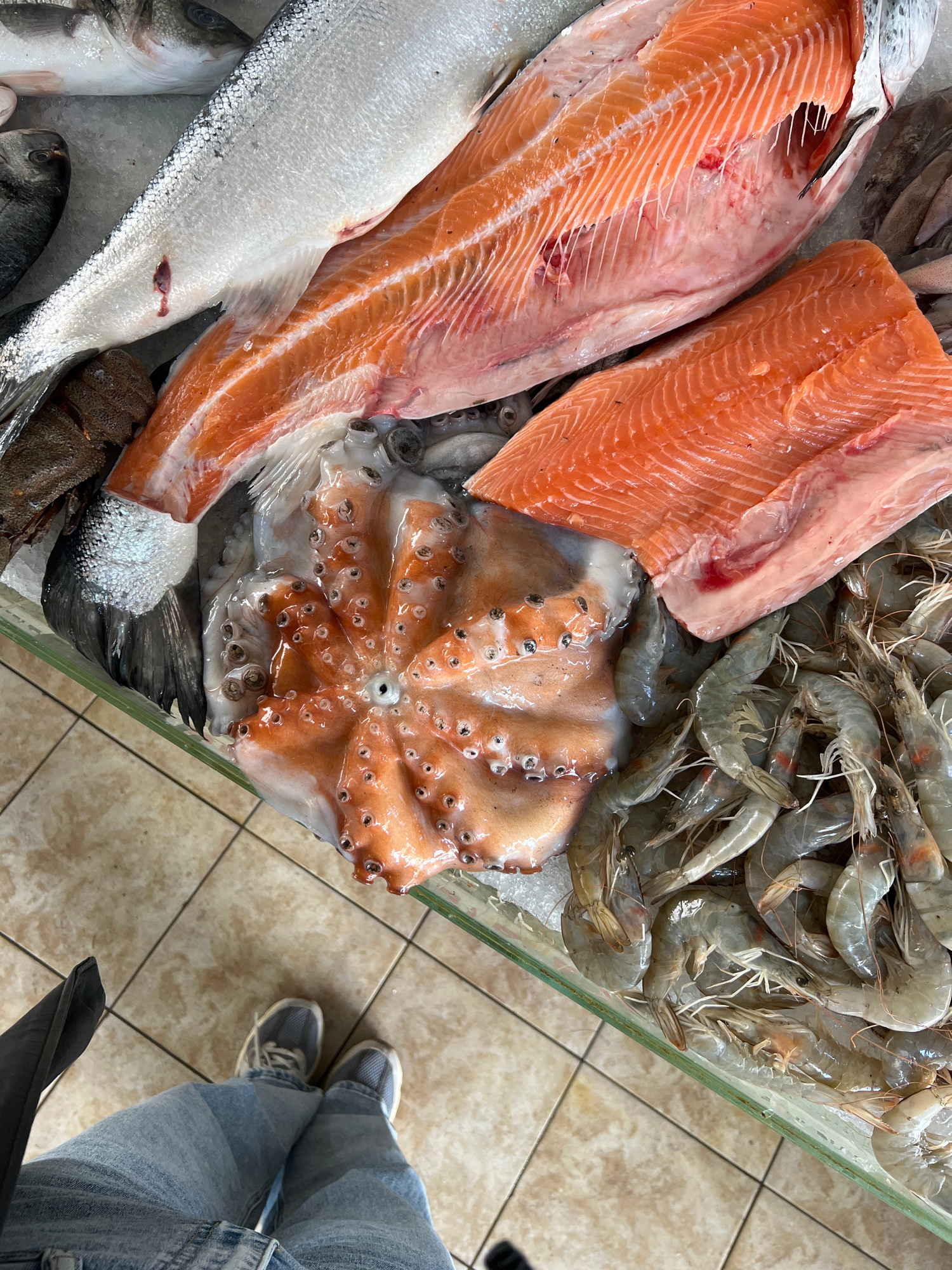 The image depicts a display of fresh seafood at a market in Bjeliši, Montenegro. Visible are various types of fish, including salmon fillets (one appears to be partially cut), whole fish (likely sea b…read more