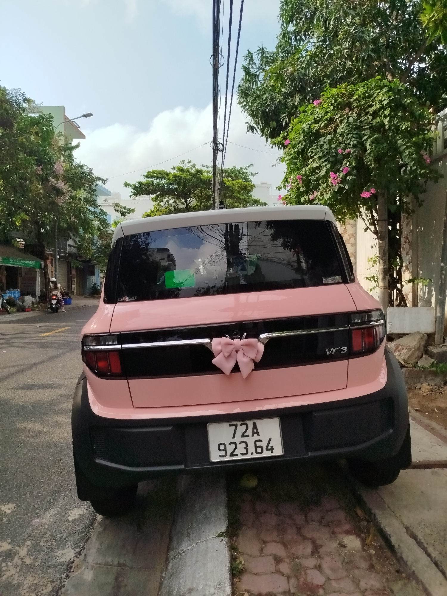 A pink VinFast VF3 electric car is parked on a street in Ho Chi Minh City, Vietnam. The rear of the car faces the camera. A light pink bow is attached to the chrome trim on the tailgate. The license p…read more