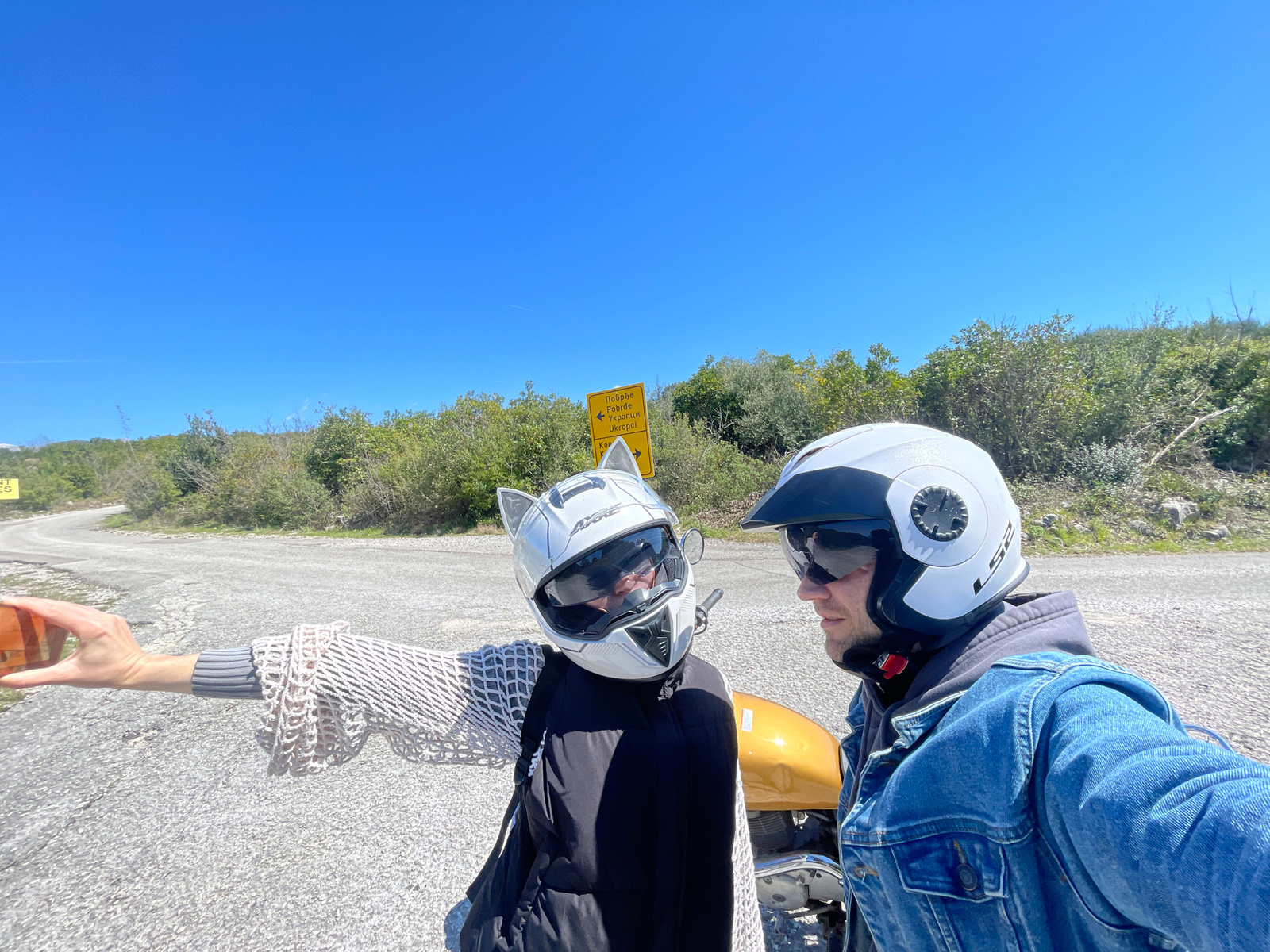 Two individuals, wearing motorcycle helmets, are positioned next to a motorcycle on a roadside in Kubasi, Montenegro. The person on the left wears a white helmet with cat ears and a mesh sweater and i…read more