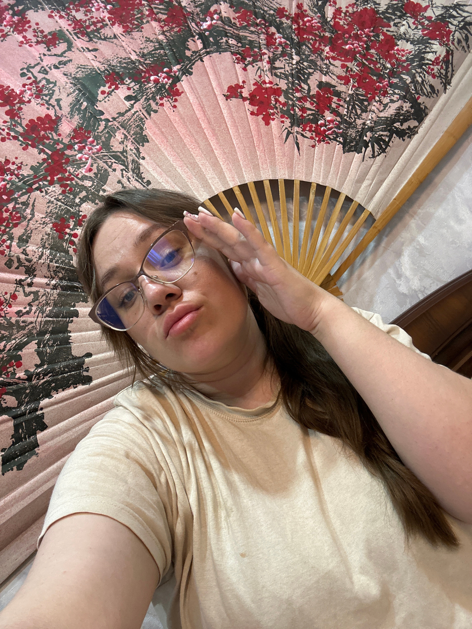 A woman with brown hair and glasses is holding an Asian-style folding fan with red and black floral designs on a beige background. She is wearing a beige T-shirt and her right hand is near her forehea…read more