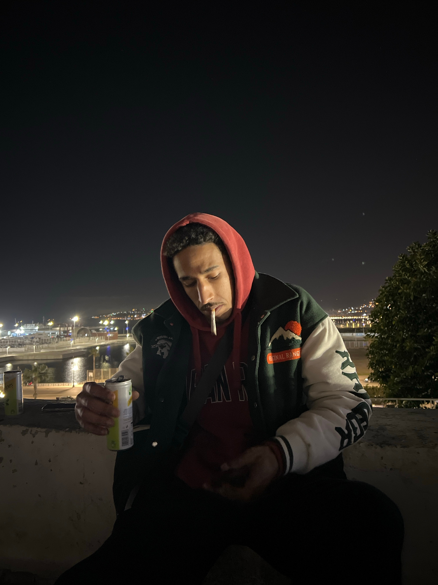 An individual is depicted at night, seated on a concrete ledge, overlooking the Port of Tanger Ville and the adjacent city in Tangier, Morocco. The subject is a male with dark curly hair, wearing a re…read more