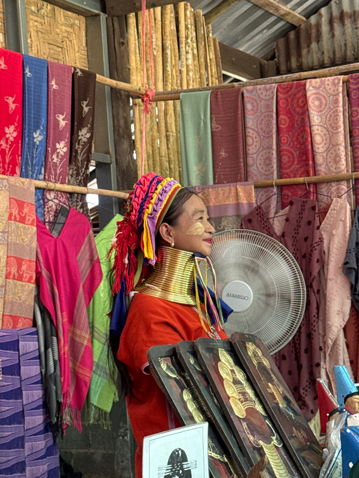 In Ban Khlong Khian, Thailand, the image shows a woman with a golden neck ring, likely a member of the Karen or Padaung ethnic group, lying down amid stacks of colorful fabrics and souvenirs. The envi…read more