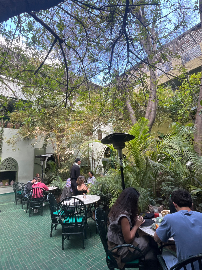 The scene depicts an open-air courtyard restaurant or cafe located in Marrakesh, Morocco. The environment is lush with extensive greenery, featuring various trees, bamboo, and palm-like plants, creati…read more