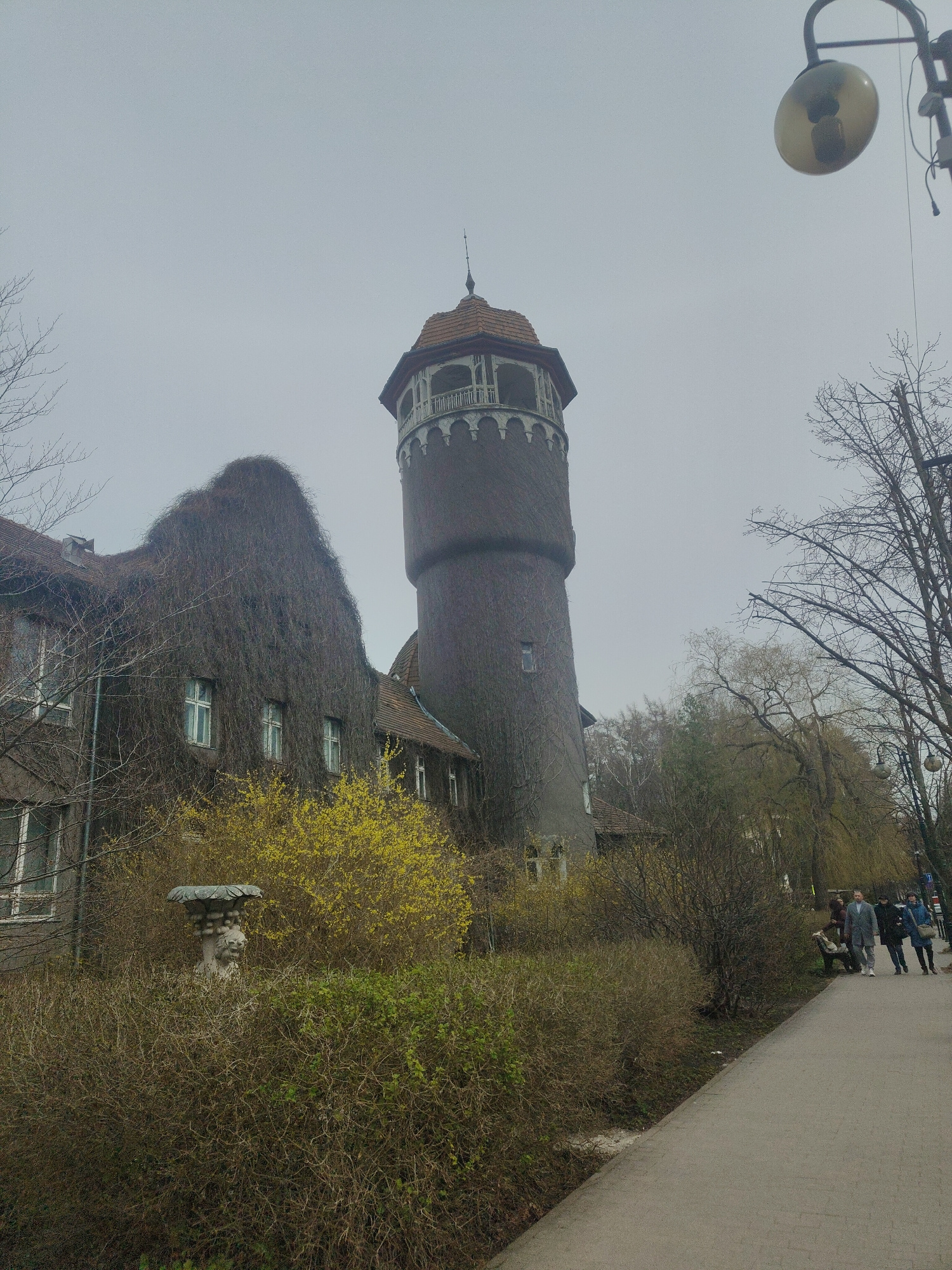 A medium shot of an overcast day depicts a water tower covered with ivy or similar climbing plant, next to a vine-covered building, in the city of Unknown, Unknown. The water tower is round with a red…read more