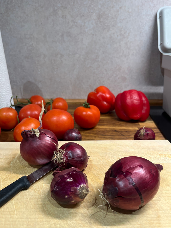 The image captures a close-up, overhead view of various fresh vegetables arranged on cutting boards, suggesting food preparation in a kitchen setting. The image itself appears to be rotated 90 degrees…read more