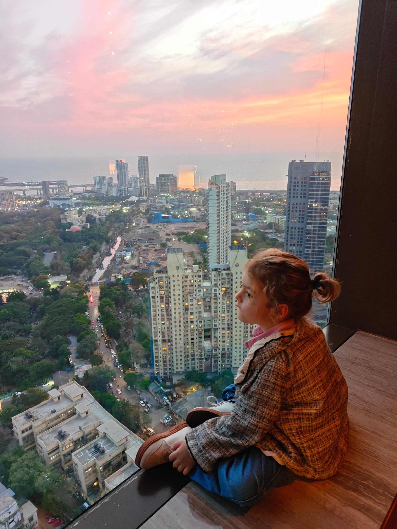 From a high vantage point overlooking Mumbai, India, a young child sits on a wooden ledge, gazing out a large window at a breathtaking cityscape during sunset. The child, with light brown hair tied inβ¦read more