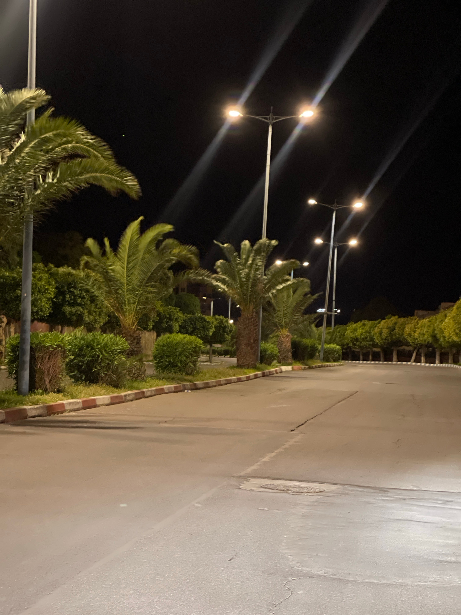 This is an outdoor night scene taken in what appears to be an urban area near Safi, Morocco. A street runs along the right side of the frame, and rows of palm trees and shrubs are planted along the st…read more