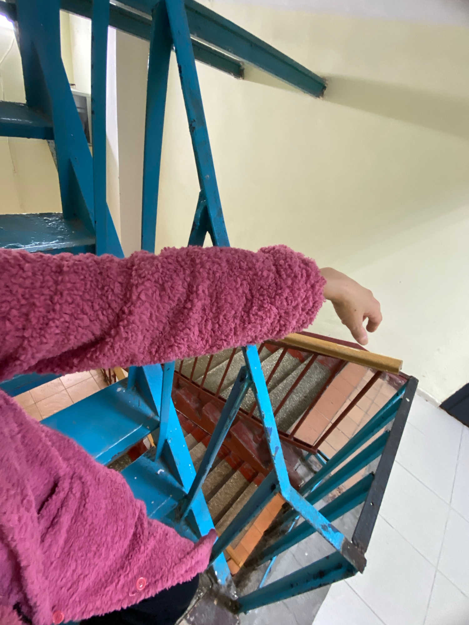 The image presents an upward-angled view within what appears to be an indoor building space, likely a stairwell or corridor in Moscow, Russia. A person is visible only through their right arm and a po…read more