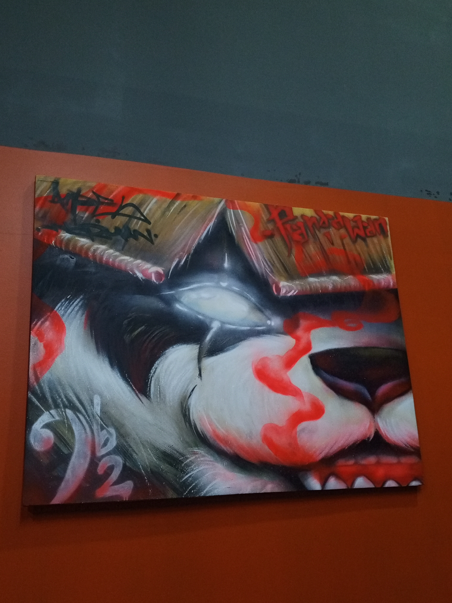 A close-up shot displays an art piece hanging on an orange wall, with a portion of a gray ceiling visible above. The artwork appears to be an abstract portrait of an animal, possibly a wolf or a simil…read more