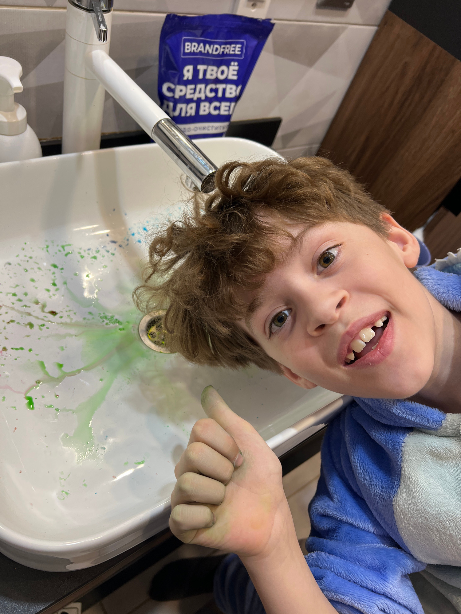 A boy, facing the camera, has his head upside down over a bathroom sink. He is fair-skinned with light brown, curly hair and is wearing a blue and white robe. He is pointing with his right hand toward…read more