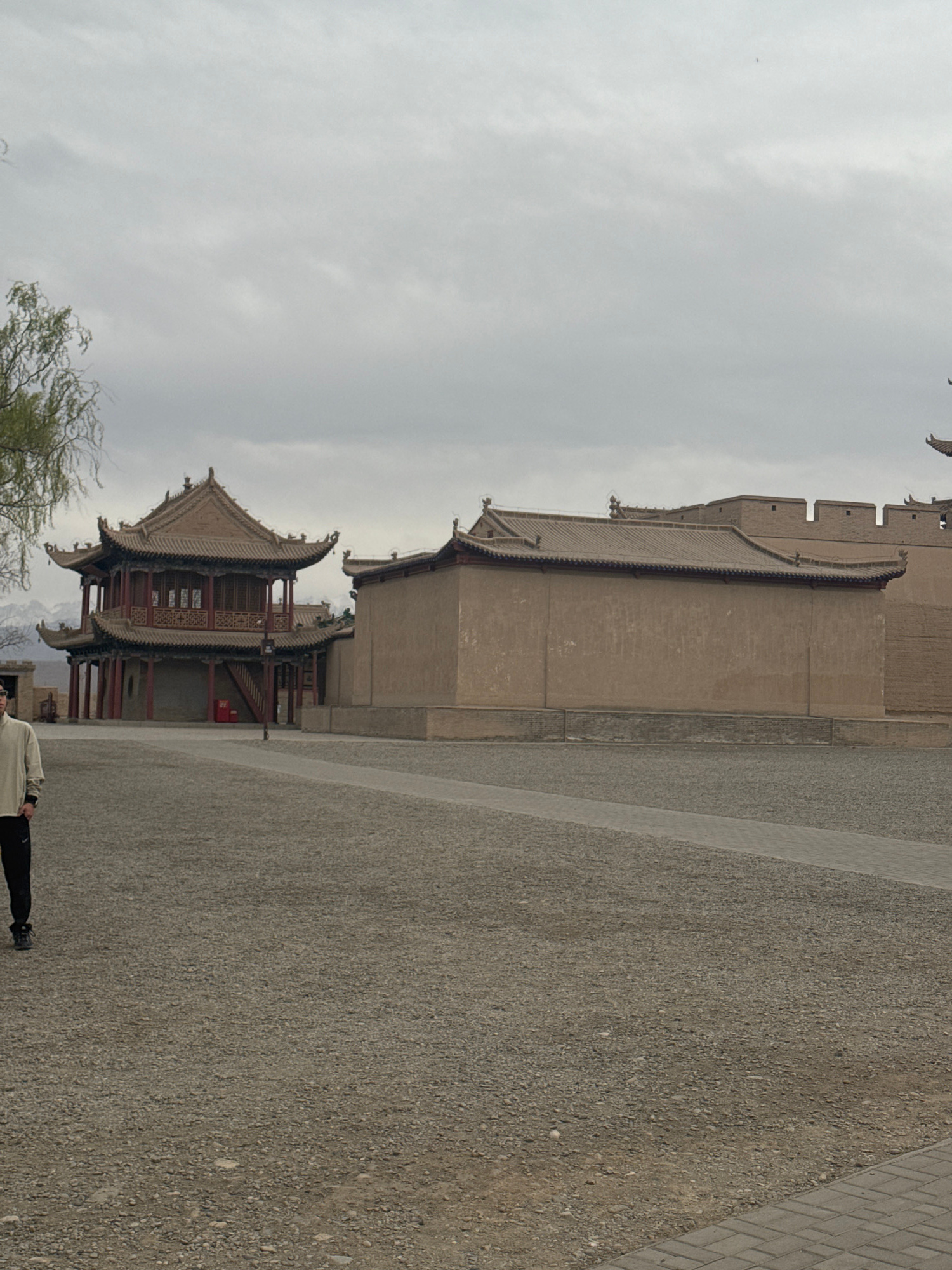 This image, rotated 90 degrees counter-clockwise, presents an outdoor scene dominated by traditional Chinese architecture under an overcast sky. In the mid-ground, a two-story pavilion with ornate, mu…read more