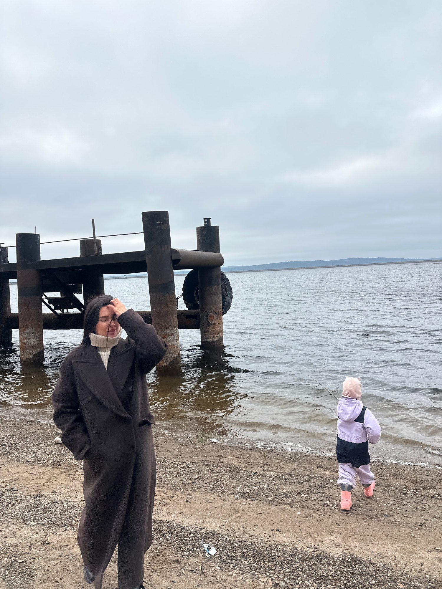 The image captures an outdoor scene by a large body of water under an overcast sky. In the foreground, positioned to the left of the frame, a person stands near a robust, weathered wooden pier. This i…read more