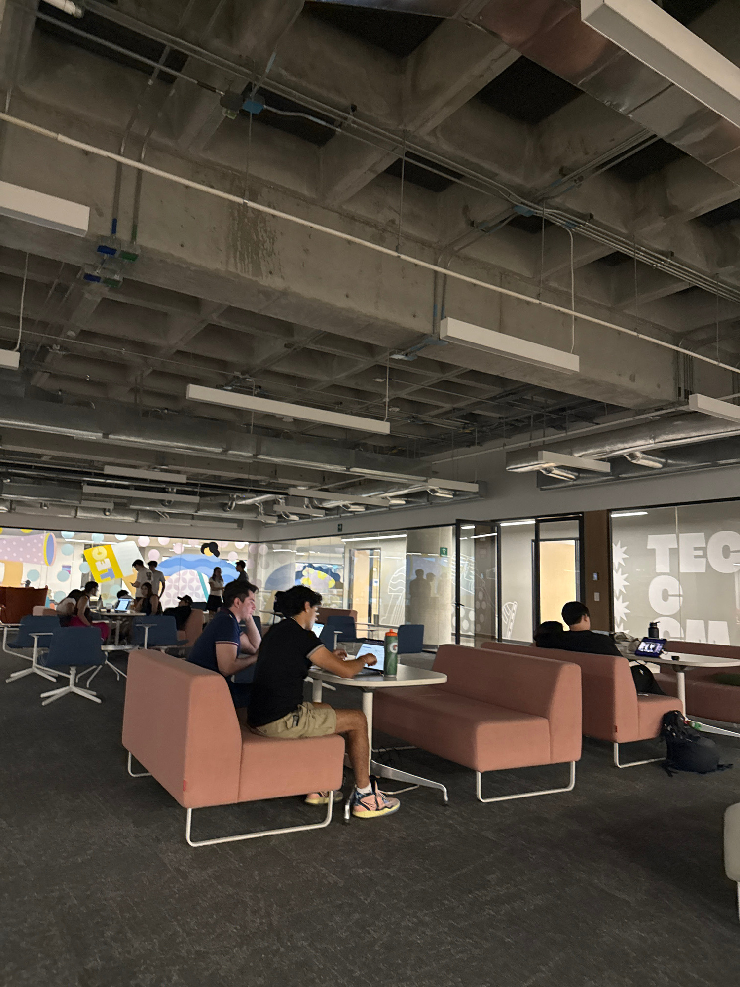 The image shows an indoor space, possibly a library or student study area, likely in Mexico City, Mexico, given the architectural and decor elements. A concrete ceiling with an exposed grid of beams a…read more