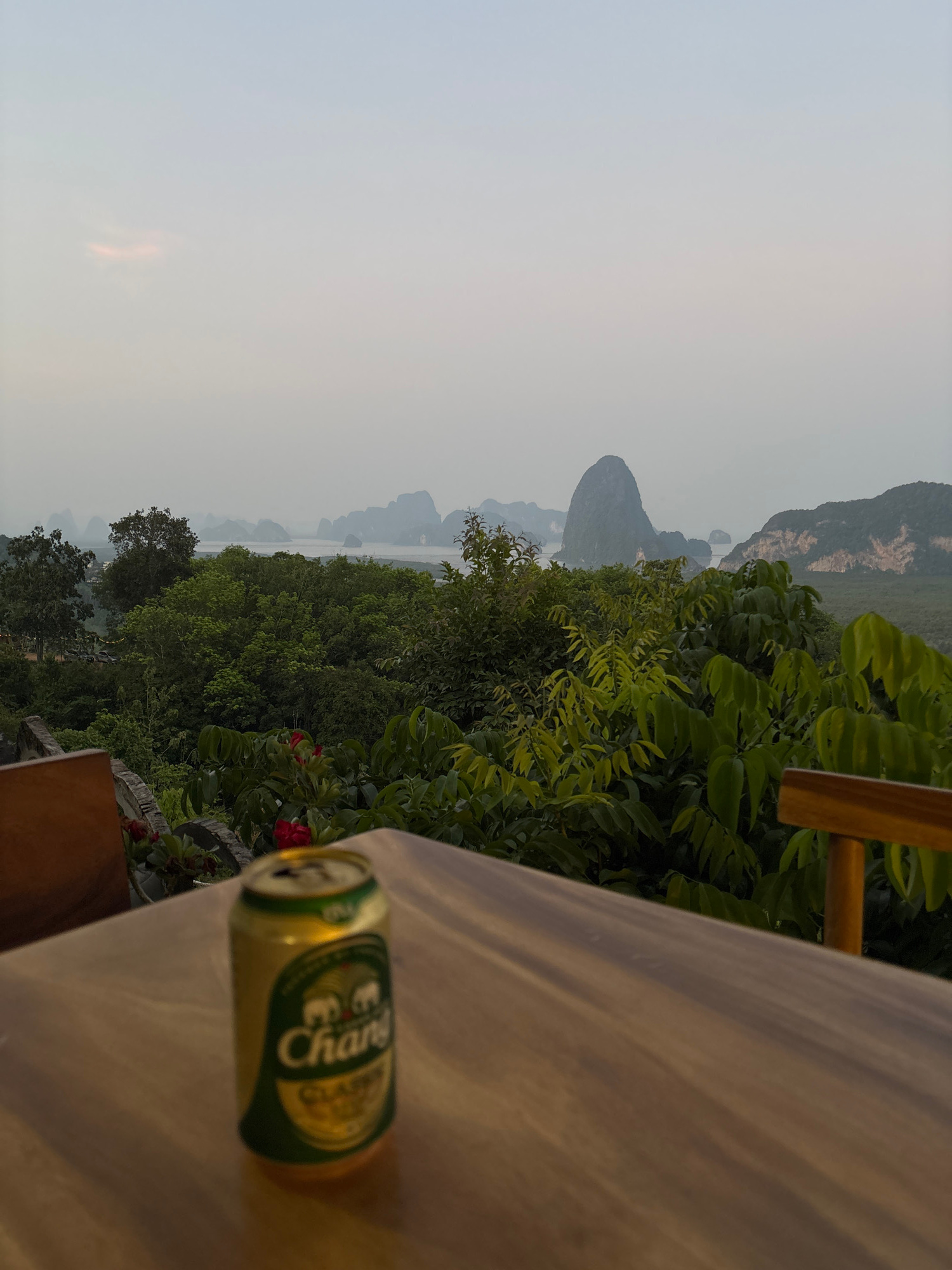 A landscape view from an elevated vantage point in Khlong Khian, Thailand. The foreground shows a partially visible table surface, upon which sits a partially consumed can of Chang beer. Beyond the ta…read more